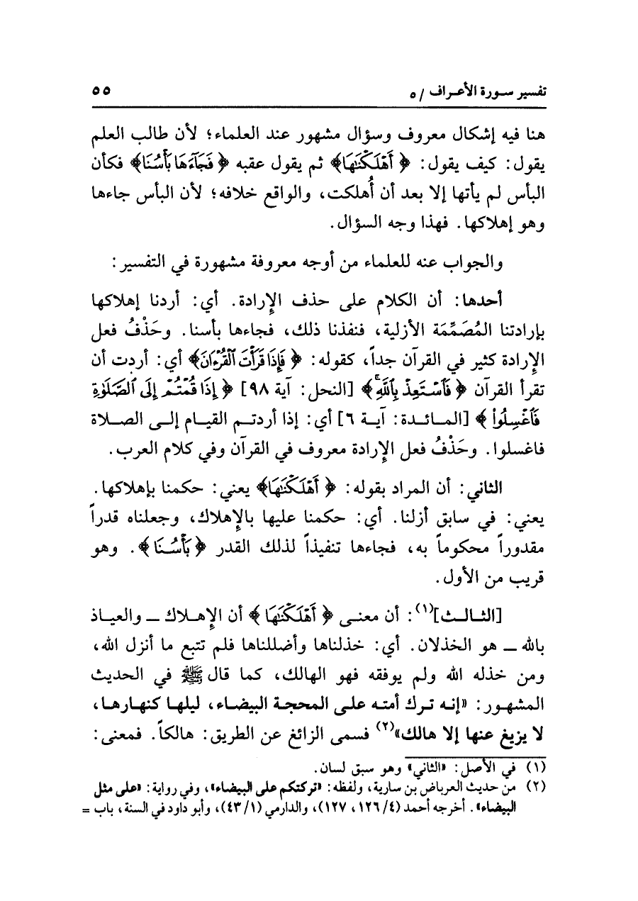 [الثالث] (¬١): أن معنى {أَهْلَكْنَاهَا} أن الإهلاك -والعياذ بالله- هو الخذلان؛ أي: خذلناها وأضْلَلْنَاهَا فلم تتبع ما أنزل الله، ومن خذله الله ولم يوفِّقْهُ فهو الهالك، كما قال صلى الله عليه وسلم في الحديث المشهور إنه ترك أمَّتَهُ على المحَجَّةِ الْبَيْضَاء، لَيْلُهَا كَنَهَارِهَا، لا يَزِيغُ عَنْهَا إِلَاّ هَالِك (¬٢). فسمى الزائغ عن الطريق: هالكاً، فمعنى: