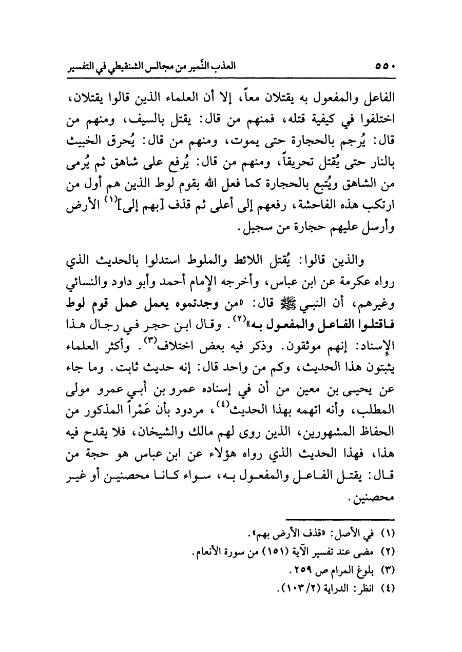 والذين قالوا: يُقْتَلُ اللائطُ والملوطُ استدلوا بالحديثِ الذي رَوَاهُ عكرمةُ عن ابنِ عباسٍ، وأخرجَه الإمامُ أحمدُ وأبو داودَ والنسائيُّ وغيرُهم، أن النبيَّ صلى الله عليه وسلم قال: «مَنْ وَجَدْتُمُوهُ يَعْمَلُ عَمَلَ قَوْمِ لُوطٍ فَاقْتُلُوا الْفَاعِلَ وَالْمَفْعُولَ بِهِ» (¬٢). وقال ابنُ حَجَرٍ في رجالِ هذا الإسنادِ: إنهم موثقونَ. وَذَكَرَ فيه بعضَ اختلافٍ (¬٣). وأكثرُ العلماءِ يُثْبِتُونَ هذا الحديثَ، وكم من واحدٍ قال: إنه حديثٌ ثابتٌ. وما جاء عن يَحْيَى بنِ مَعِينٍ من أن في إسنادَه عمرُو بنُ أبِي عمرٍو مَوْلَى المطلب، وأنه اتَّهَمَهُ في هذا الحديثِ (¬٤)، مردودٌ بأن عَمْرًا المذكورَ من الحفاظِ المشهورين، الذين رَوَى لهم مالكٌ والشيخانِ، فلا يقدحُ فيه هذا، فهذا الحديثُ الذي رواه هؤلاء عن ابنِ عباسٍ هو حجةُ مَنْ قال: يُقْتَلُ الفاعلُ والمفعولُ به، سواء كانا مُحْصَنَيْنِ أو غَيْرَ مُحْصَنَيْنِ.