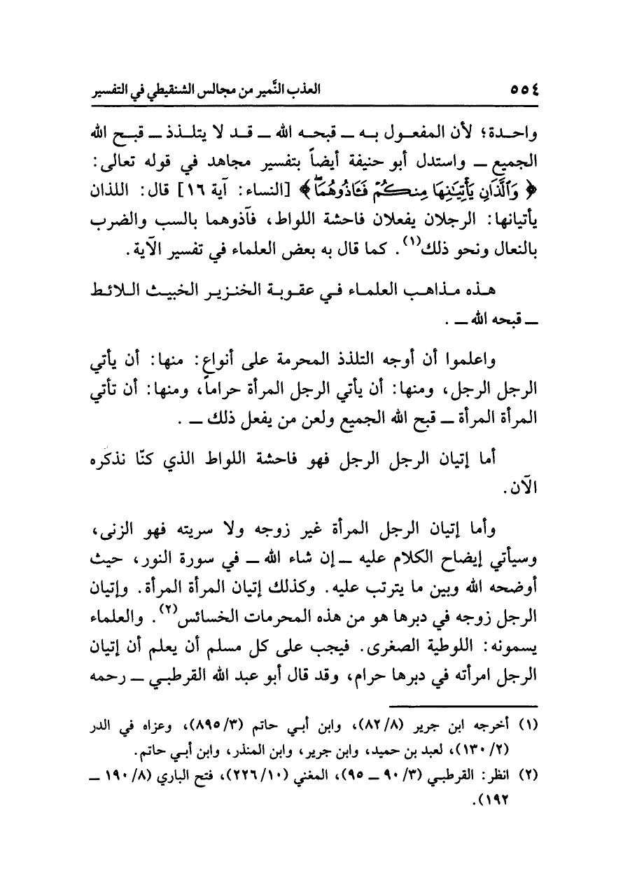 واحدةٍ؛ لأَنَّ المفعولَ به - قَبَّحَهُ اللَّهُ - قد لَا يتلذذُ - قبح الله الجميعَ - واستدلَّ أبو حنيفةَ أيضًا بتفسيرِ مجاهدٍ في قولِه تعالى: {وَاللَّذَانَ يَأْتِيَانِهَا مِنْكُمْ فَآذُوهُمَا} [النساء: آية ١٦] قال: اللَّذَانِ يأتيانها: الرَّجُلَانِ يفعلانِ فاحشةَ اللواطِ، فَآذُوهُمَا بالسبِّ والضربِ بالنعالِ ونحوِ ذلك (¬١). كما قال به بعضُ العلماءِ في تفسيرِ الآيةِ.