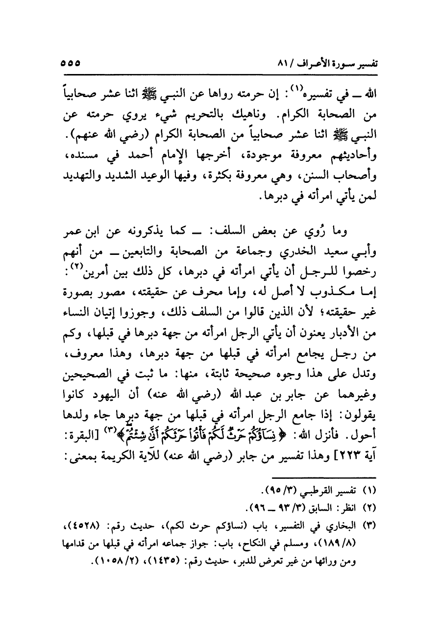 وما رُوِيَ عن بعضِ السلفِ: - كما يذكرونَه عن ابنِ عُمَرَ وأبي سعيدٍ الخدريِّ وجماعةٍ من الصحابةِ والتابعين - من أنهم رَخَّصُوا للرجلِ أن يأتيَ امرأتَه في دُبُرِهَا، كل ذلك بَيْنَ أَمْرَيْنِ (¬٢): إما مكذوبٌ لا أصلَ له، وإما مُحَرَّفٌ عن حقيقتِه، مُصَوَّرٌ بصورةٍ غيرِ حقيقتِه؛ لأن الذين قالوا من السلفِ ذلك، وَجَوَّزُوا إتيانَ النساءِ من الأدبارِ يَعْنُونَ أن يأتيَ الرجلُ امرأتَه من جهةِ دُبُرِهَا في قُبُلِهَا، وَكَمْ من رجلٍ يجامعُ امرأتَه في قُبُلِهَا من جهةِ دُبُرِهَا، وهذا معروفٌ، وتدلُّ على هذا وجوهٌ صحيحةٌ ثابتةٌ، منها: ما ثَبَتَ في الصحيحين وغيرِهما عن جابرِ بنِ عبدِ اللَّهِ (رضي الله عنه) أن اليهودَ كانوا يقولونَ: إذا جَامَعَ الرجلُ امرأتَه في قُبُلِهَا من جهةِ دُبُرِهَا جاءَ ولدُها أحولَ. فأنزل اللهُ: {نِسَاؤُكُمْ حَرْثٌ لَّكُمْ فَأْتُوا حَرْثَكُمْ أَنَّى شِئْتُمْ} (¬٣) [البقرة: آية ٢٢٣] وهذا تفسيرٌ من جابرٍ (رضي الله عنه) للآيةِ الكريمةِ بمعنَى: