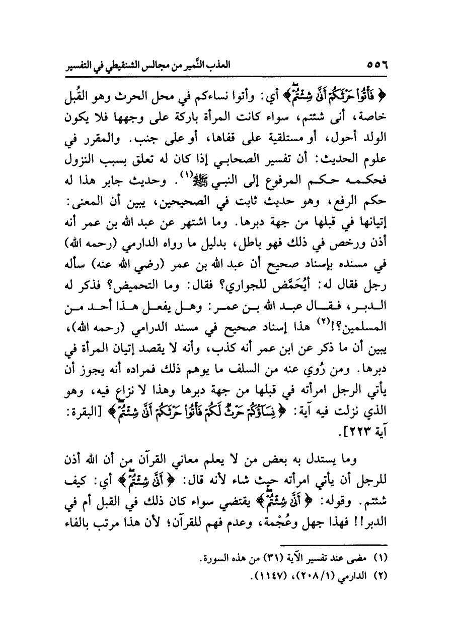 وما اشتهر عن عبدِ اللَّهِ بنِ عمرَ أنه أَذِنَ وَرَخَّصَ في ذلك فهو باطلٌ؛ بدليلِ ما رواه الدارميُّ (رحمه الله) في مسندِه بإسنادٍ صحيحٍ أن عبدَ اللَّهِ بنَ عمرَ (رضي الله عنهما) سأله رجلٌ فقال له: أيُحَمَّضُ لِلْجَوَارِي؟ فقال: وما التحميضُ؟ فَذَكَرَ له الدبرَ، فقال عبدُ اللهِ بنُ عمرَ: وهل يفعلُ هذا أحدٌ من المسلمين؟! (¬٢) هذا إسنادٌ صحيحٌ في مسندِ الدراميِّ (رحمه الله)، يُبَيِّنُ أن ما ذُكِرَ عن ابنِ عمرَ أنه كَذِبٌ، وأنه لا يَقْصِدُ إتيانَ المرأةِ في دُبُرِهَا. وَمَنْ رُوِيَ عنه من السلفِ ما يُوهِمُ ذلك فمرادُه أنه يجوزُ أن يأتِي الرجلُ امرأتَه في قبلِها من جهةِ دبرِها وهذا لا نَهْيَ فيه، وهو الذي نَزَلَتْ فيه آيةُ: {نِسَاؤُكُمْ حَرْثٌ لَّكُمْ فَأْتُوا حَرْثَكُمْ أَنَّى شِئْتُمْ} [البقرة: آية ٢٢٣].