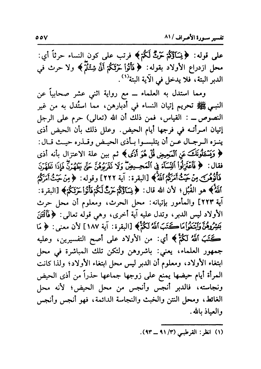 ومما استدلَّ به العلماءُ - مع روايةِ اثني عشرَ صَحَابِيًّا عن النبيِّ صلى الله عليه وسلم تحريمُ إتيانِ النساءِ في أدبارِهن، مما استُدلَّ به من غيرِ النصوصِ -: القياسُ، فَمِنْ ذلك أن اللهَ (تعالى) حَرَّمَ على الرجلِ إتيانَ امرأتِه في فَرْجِهَا أيامَ الحيضِ. وَعَلَّلَ ذلك بأن الحيضَ أَذًى يُنَزِّهُ الرجالَ عن أن يتلبسوا بأذَى الحيضِ وقذرِه حيث قال: {وَيَسْأَلُونَكَ عَنِ الْمَحِيضِ قُلْ هُوَ أَذًى} ثم بَيَّنَ علةَ الاعتزالِ بأنه أَذًى فقال: {فَاعْتَزِلُوا النِّسَاءَ فِي الْمَحِيضِ وَلَا تَقْرَبُوهُنَّ حَتَّىَ يَطْهُرْنَ فَإِذَا تَطَهَّرْنَ فَأْتُوهُنَّ مِنْ حَيْثُ أَمَرَكُمُ اللَّهُ} [البقرة: آية ٢٢٢] وقولُه: {مِنْ حَيْثُ أَمَرَكُمُ اللَّهُ} هو القبُلُ؛ لأن اللَّهَ قال: {نِسَاؤُكُمْ حَرْثٌ لَّكُمْ فَأْتُوا حَرْثَكُمْ} [البقرة: آية ٢٢٣] والمأمورُ بإتيانِه: محلُّ الحرثِ، ومعلومٌ أن محلَّ حرثِ الأولادِ ليس الدبرَ، وتدلُّ عليه آيةٌ أخرى، وهي قولُه تعالى: {فَالآنَ بَاشِرُوهُنَّ وَابْتَغُوا مَا كَتَبَ اللَّهُ لَكُمْ} [البقرة آية ١٨٧] لأن معنَى: {مَا كَتَبَ اللَّهُ لَكُمْ} أي: من الأولادِ على أصحِّ التفسيرين، وعليه جمهورُ العلماءِ، يعنِي: بَاشِرُوهُنَّ وَلْتَكُنْ تلك المباشرةُ في محلِّ ابتغاءِ الأولادِ، ومعلومٌ أن الدبرَ ليس محلَّ ابتغاءِ الأولادِ؛ ولذا كانت المرأةُ أيامَ حيضِها يُمْنَعُ على زوجِها جِمَاعُهَا حَذَرًا من أذَى الحيضِ ونجاستِه، فالدبرُ أنجسُ وأنجسُ من محلِّ الحيضِ؛ لأنه محلُّ الغائطِ، ومحلُّ النتنِ والخبثِ والنجاسةِ الدائمةِ، فهو أنجسُ وأنجسُ والعياذُ بالله.