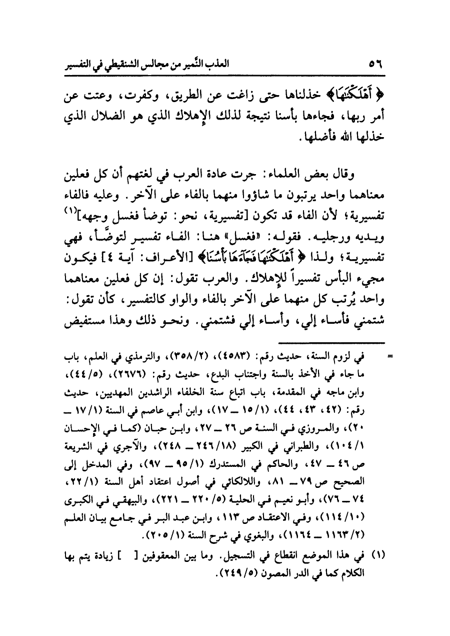 وقال بعض العلماء: جرت عادة العرب في لغتهم أن كل فعلين معناهما واحد يرتبون ما شاءوا منهما بالفاء على الآخر. وعليه فالفاء تفسيرية؛ لأن الفاء قد تكون [تفسيرية، نحو: توضأ فغسل وجهه] (¬١) ويديه ورجليه. فقوله: «فغسل» هنا: الفاء تفسير لتوضَّأ، فهي تفسيرية؛ ولذا {أَهْلَكْنَاهَا فَجَاءهَا بَأْسُنَا} [الأعراف: آية ٤] فيكون مجيء البأس تفسيراً للإهلاك. والعرب تقول: إن كل فعلين معناهما واحد يُرتب كل منهما على الآخر بالفاء والواو كالتفسير، كأن تقول: شتمني فأساء إلي، وأساء إلي فشتمني. ونحو ذلك وهذا مستفيض