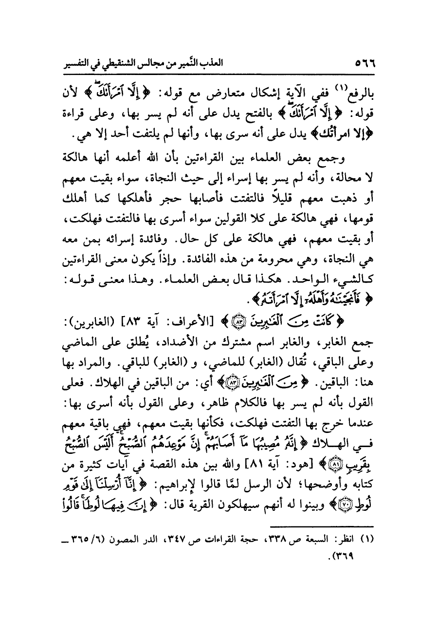وَجَمَعَ بعضُ العلماءِ بينَ القراءتين بأن اللهَ أَعْلَمَهُ أنها هالكةٌ لا مَحَالَةَ، وأنه لم يَسْرِ بها إسراءً إلى حيثُ النجاةُ، سواء بَقِيَتْ معهم أو ذَهَبَتْ معهم قليلاً فالتفتت فأصابَها حجرٌ فأهلكها كما أَهْلَكَ قومَها، فهي هالكةٌ على كِلَا القولين سواء أَسْرَى بها فالتفتت فهلكت، أو بقيت معهم، فهي هالكةٌ على كُلِّ حالٍ. وفائدةُ إسرائِه بِمَنْ معه هي النجاةُ، وهي محرومةٌ من هذه الفائدةِ. وإذًا يكونُ معنَى القراءتين كالشيءِ الواحدِ. هكذا قال بعضُ العلماءِ. وهذا معنَى قولِه: {فَأَنْجَيْنَاهُ وَأَهْلَهُ إِلَاّ امْرَأَتَهُ}.