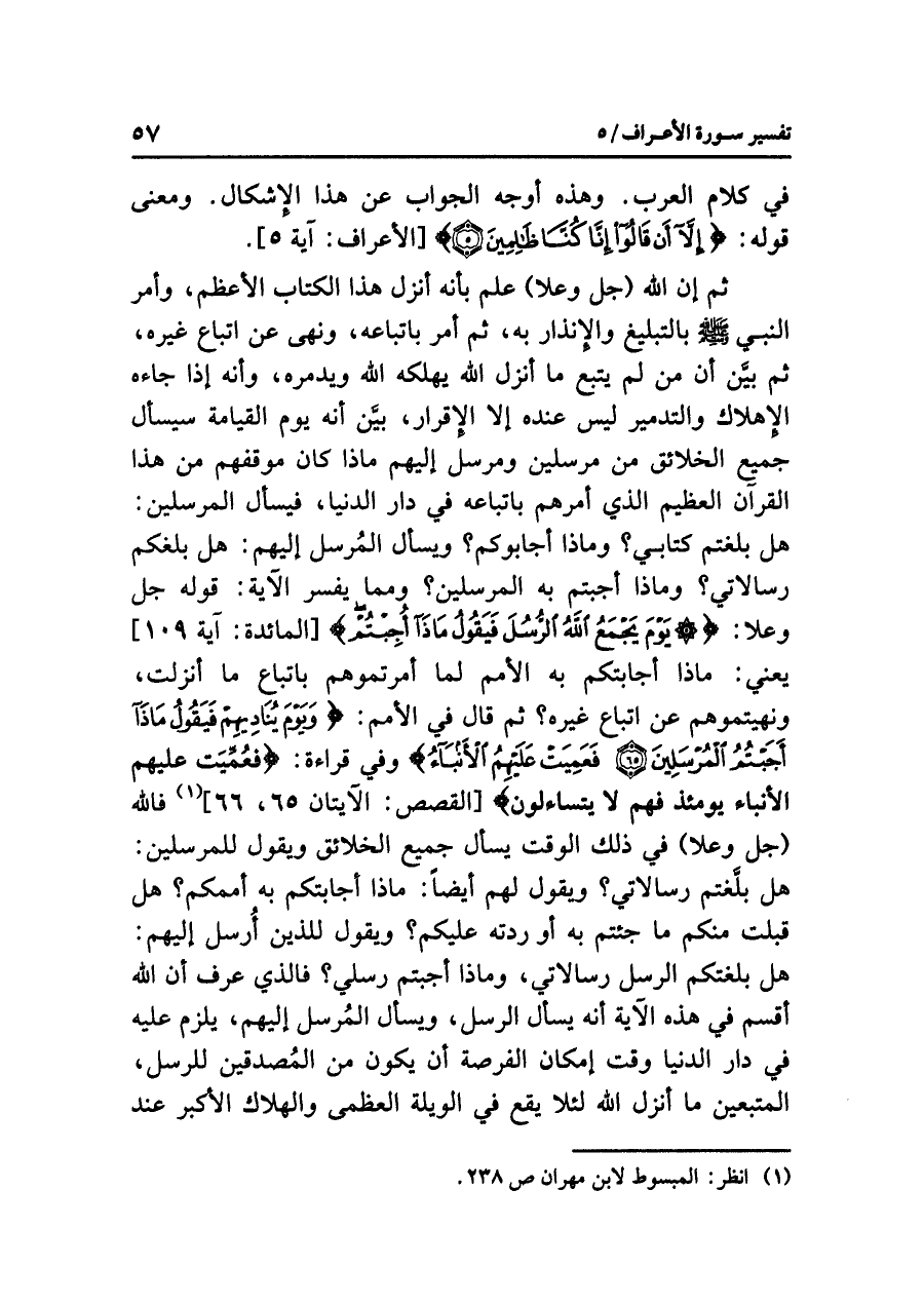 ومعنى قوله: {إِلَاّ أَن قَالُواْ إِنَّا كُنَّا ظَالِمِينَ} [الأعراف: آية ٥] ثم إن الله (جل وعلا) علم بأنه أنزل هذا الكتاب الأعظم، وأمر النبي صلى الله عليه وسلم بالتبليغ والإنذار به، ثم أمر باتباعه، ونهى عن اتباع غيره، ثم بيَّن أن من لم يتبع ما أنزل الله يهلكه الله ويدمره، وأنه إذا جاءه الإهلاك والتدمير ليس عنده إلا الإقرار، بيَّن أنه يوم القيامة سيسأل جميع الخلائق من مرسلين ومرسل إليهم ماذا كان موقفهم من هذا القرآن العظيم الذي أمرهم باتباعه في دار الدنيا، فيسأل المرسلين: هل بلغتم كتابي؟ وماذا أجابوكم؟ ويسأل المُرسل إليهم: هل بلغكم رسالاتي؟ وماذا أجبتم به المرسلين؟ ومما يفسر الآية: قوله جل وعلا: {يَوْمَ يَجْمَعُ الله الرُّسُلَ فَيَقُولُ مَاذَا أُجِبْتُمْ} [المائدة: آية ١٠٩] يعني: ماذا أجابتكم به الأمم لما أمرتموهم باتباع ما أنزلت، ونهيتموهم عن اتباع غيره؟ ثم قال في الأمم: {وَيَوْمَ يُنَادِيهِمْ فَيَقُولُ مَاذَا أَجَبْتُمُ الْمُرْسَلِينَ (٦٥) فَعَمِيَتْ عَلَيْهِمُ الْأَنبَاء} وفي قراءة: {فَعُمِّيَتْ عَلَيْهِمُ الأَنْبَاءُ يَوْمَئِذٍ فَهُمْ لَا يَتَسَاءَلَونَ} [القصص: الآيتان ٦٥، ٦٦] (¬١) فالله (جل وعلا) في ذلك الوقت يسأل جميع الخلائق ويقول للمرسلين: هل بلَّغتم رسالاتي؟ ويقول لهم أيضاً: ماذا أجابتكم به أممكم؟ هل قبلت منكم ما جئتم به أو ردته عليكم؟ ويقول للذين أُرسل إليهم: هل بَلَّغَتْكُم الرسلَ رسالاتي، وماذا أجبتم رُسُلي؟ فالذي عرف أن الله أقسم في هذه الآية أنه يسأل الرسل، ويسأل المُرسل إليهم، يلزم عليه في دار الدنيا وقت إمكان الفرصة أن يكون من المُصدقين للرسل، المتبعين ما أنزل الله لئلا يقع في الويلة العظمى والهلاك الأكبر عند
