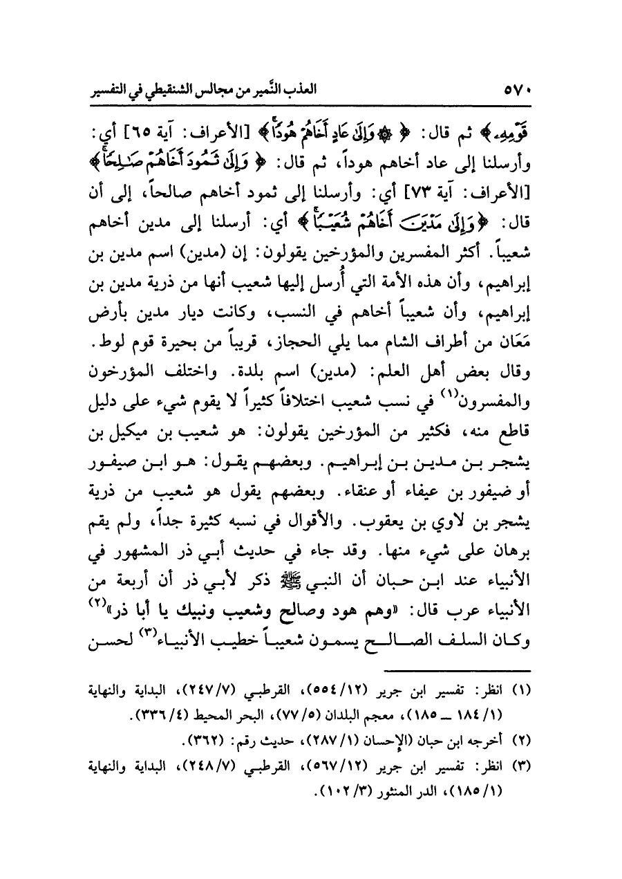 قَوْمِهِ} ثم قال: {وَإِلَى عَادٍ أَخَاهُمْ هُودًا} [الأعراف: آية ٦٥] أي: وَأَرْسَلْنَا إلى عادٍ أَخَاهُمْ هودًا، ثم قال: {وَإِلَى ثَمُودَ أَخَاهُمْ صَالِحًا} [الأعراف: آية ٧٣] أَيْ: وَأَرْسَلْنَا إلى ثمودَ أخاهم صالحًا، إلى أن قال: {وَإِلَى مَدْيَنَ أَخَاهُمْ شُعَيْبًا} أي: أَرْسَلْنَا إلى مدينَ أخاهُم شعيبًا. أكثرُ المفسرين والمؤرخين يقولونَ: إن (مدينَ) اسمُ مدينَ بنِ إبراهيمَ، وأن هذه الأمةَ التي أُرْسِلَ إليها شعيبٌ أنها من ذريةِ مدينَ بنِ إبراهيمَ، وأن شعيبًا أخاهم في النسبِ، وكانت ديارُ مدينَ بأرضِ مَعَانٍ من أطرافِ الشامِ مما يلي الحجازَ، قريبًا من بحيرةِ قومِ لوطٍ. وقال بعضُ أهلِ العلمِ: (مَدْيَنُ) اسمُ بلدةٍ. واختلفَ المؤرخونَ والمفسرونَ (¬١) في نسبِ شعيبٍ اختلافًا كثيرًا لا يقومُ شيءٌ على دليلٍ قاطعٍ منه، فكثيرٌ من المؤرخينَ يقولونَ: هو شعيبُ بنُ ميكيلَ بنِ يشجرَ بنِ مدينَ بنِ إبراهيمَ. وبعضُهم يقولُ: هو ابنُ صيفورَ أو ضيفورَ بنِ عيفاءَ أو عنقاءَ. وبعضُهم يقول: هو شعيبٌ من ذريةِ يشجرَ بنِ لَاوِي بنِ يعقوبَ. والأقوالُ في نَسَبِهِ كثيرةٌ جِدًّا، ولم يَقُمْ برهانٌ على شيءٍ منها.