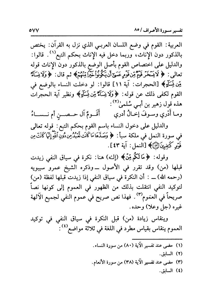 العربيةِ: القومُ في وضعِ اللسانِ العربيِّ الذي نَزَلَ به القرآنُ: يختصُّ بالذكورِ دونَ الإناثِ، وربما دَخَلَ فيه الإناثُ بحكمِ التبعِ (¬١). قالوا: والدليلُ على اختصاصِ القومِ بأصلِ الوضعِ بالذكورِ دونَ الإناثِ قولُه تعالى: {لَا يَسْخَرْ قَومٌ مِّنْ قَوْمٍ عَسَى أَنْ يَكُونُوا خَيْرًا مِّنْهُمْ} ثم قال: {وَلَا نِسَاءٌ مِّن نِّسَاءٍ} [الحجرات: آية ١١] قالوا: لو دَخَلَتِ النساءُ بالوضعِ في القومِ لَكَفَى ذلك عن قولِه: {وَلَا نِسَاءٌ مِّن نِّسَاءٍ} ونظيرُ آيةِ الحجراتِ هذه قولُ زهيرِ بنِ أبي سُلمى (¬٢):