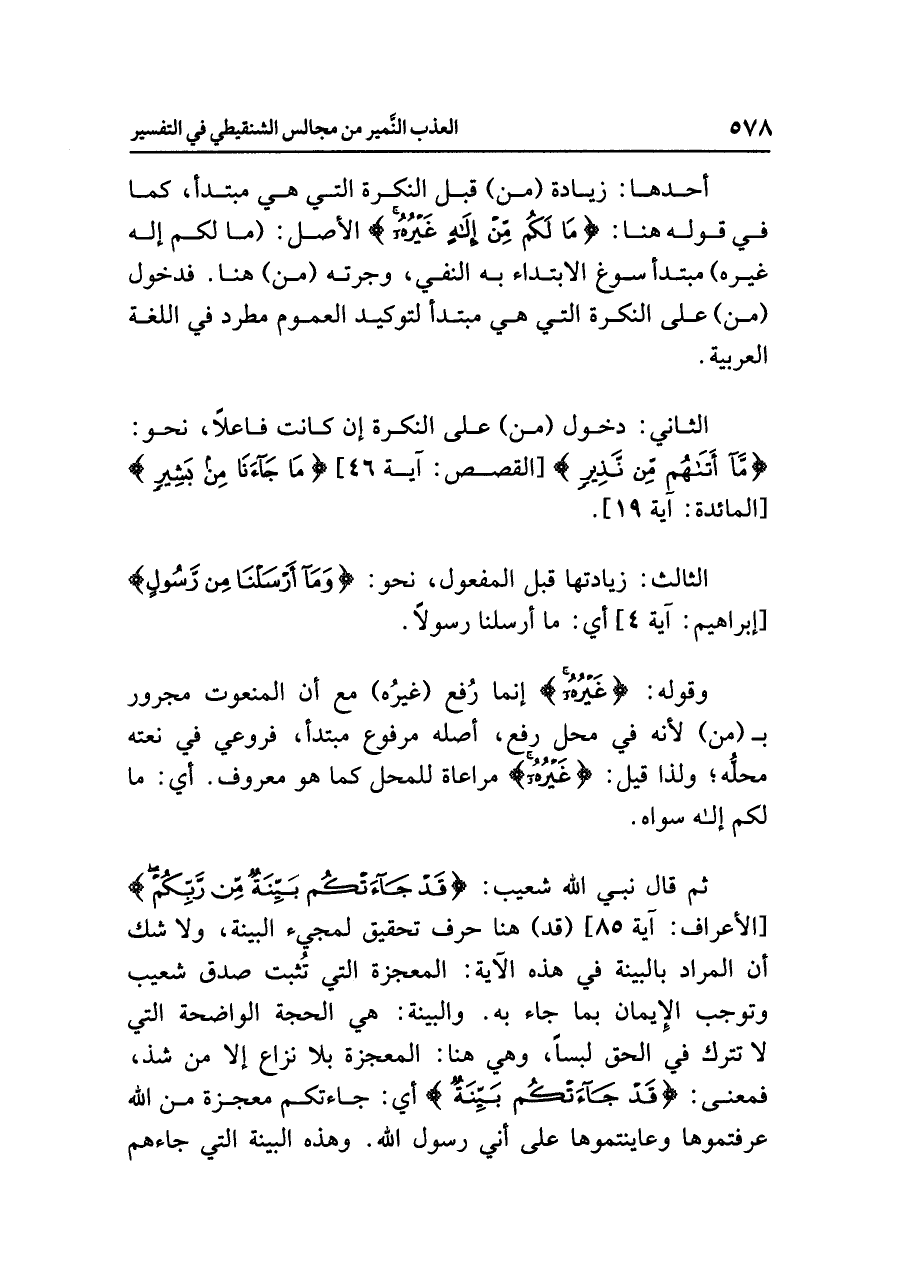 أحدُها: زيادةُ (مِنْ) قَبْلَ النكرةِ التي هي مبتدأٌ، كما في قولِه هنا: {مَا لَكُم مِّنْ إِلَهٍ غَيْرُهُ} الأصلُ: (ما لكم إله غيره) مبتدأٌ سَوَّغَ الابتداءَ به النفيُ، وَجَرَّتْهُ (مِنْ) هنا. فدخولُ (من) على النكرةِ التي هي مبتدأٌ لتوكيدِ العمومِ مطردٌ في اللغةِ العربيةِ.
