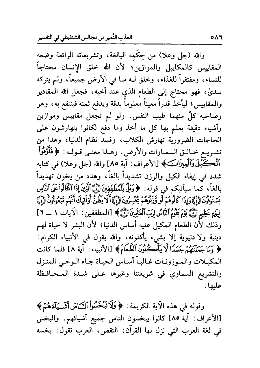 وَاللَّهُ (جل وعلا) مِنْ حِكَمِهِ البالغةِ، وتشريعاتِه الرائعةِ وَضْعُهُ المقاييسَ كالمكاييلِ والموازين؛ لأَنَّ اللَّهَ خَلَقَ الإنسانَ مُحْتَاجًا للنساءِ، وَمُفْتَقِرًا للغذاءِ، وخلق له ما في الأرضِ جميعًا، ولم يتركه سُدًى، فهو محتاجٌ للطعامِ الذي عِنْدَ أَخِيهِ، فَجَعَلَ اللَّهُ المقاديرَ والمقاييسَ؛ ليأخذَ قَدْرًا مُعَيَّنًا معلومًا بدقةٍ ويدفعُ ثمنَه فينتفعُ به، وهو وصاحبُه كُلٌّ منهما طيبُ النفسِ. ولو لم تُجْعَلْ مقاييسُ وموازينُ وأشياءٌ دقيقةٌ يعلم بها كُلُّ ما أخذ وما دفع لكانوا يتهارشون على الحاجاتِ الضروريةِ تهارشَ الكلابِ، وَفَسَدَ نظامُ الدنيا، وهذا من تشريعِ خالقِ السماواتِ والأرضِ. وهذا معنَى قولِه: {فَأَوْفُوا الْكَيْلَ وَالْمِيزَانَ} [الأعراف: آية ٨٥] والله (جل وعلا) في كتابِه شَدَّدَ في إيفاءِ الكيلِ والوزنِ تشديدًا بالغًا، وهددَ مَنْ يخونُ تهديدًا بالغًا، كما سيأتيكم في قولِه: {وَيْلٌ لِّلْمُطَفِّفِينَ (١) الَّذِينَ إِذَا اكْتَالُوا عَلَى النَّاسِ يَسْتَوْفُونَ (٢) وَإِذَا كَالُوهُمْ أَو وَّزَنُوهُمْ يُخْسِرُونَ (٣) أَلَا يَظُنُّ أُولَئِكَ أَنَّهُم مَّبْعُوثُونَ (٤) لِيَوْمٍ عَظِيمٍ (٥) يَوْمَ يَقُومُ النَّاسُ لِرَبِّ الْعَالَمِينَ (٦)} [المطففين: الآيات ١ - ٦] وذلك لأَنَّ الطعامَ المكيلَ عليه أساسُ الدنيا؛ لأن البشرَ لا حياةَ لهم دينيةٌ ولا دنيويةٌ إلا بشيءٍ يأكلونَه، واللَّهُ يقولُ في الأنبياءِ الْكِرَامِ: {وَمَا جَعَلْنَاهُمْ جَسَدًا لَاّ يَأْكُلُونَ الطَّعَامَ} [الأنبياء: آية ٨] فَلَمَّا كانت المكيلاتُ والموزوناتُ غالبًا أساسَ الحياةِ جاءَ الوحيُ المنزلُ والتشريعُ السماويُّ في شريعتِنا وغيرِها على شِدَّةِ المحافظةِ عليها.