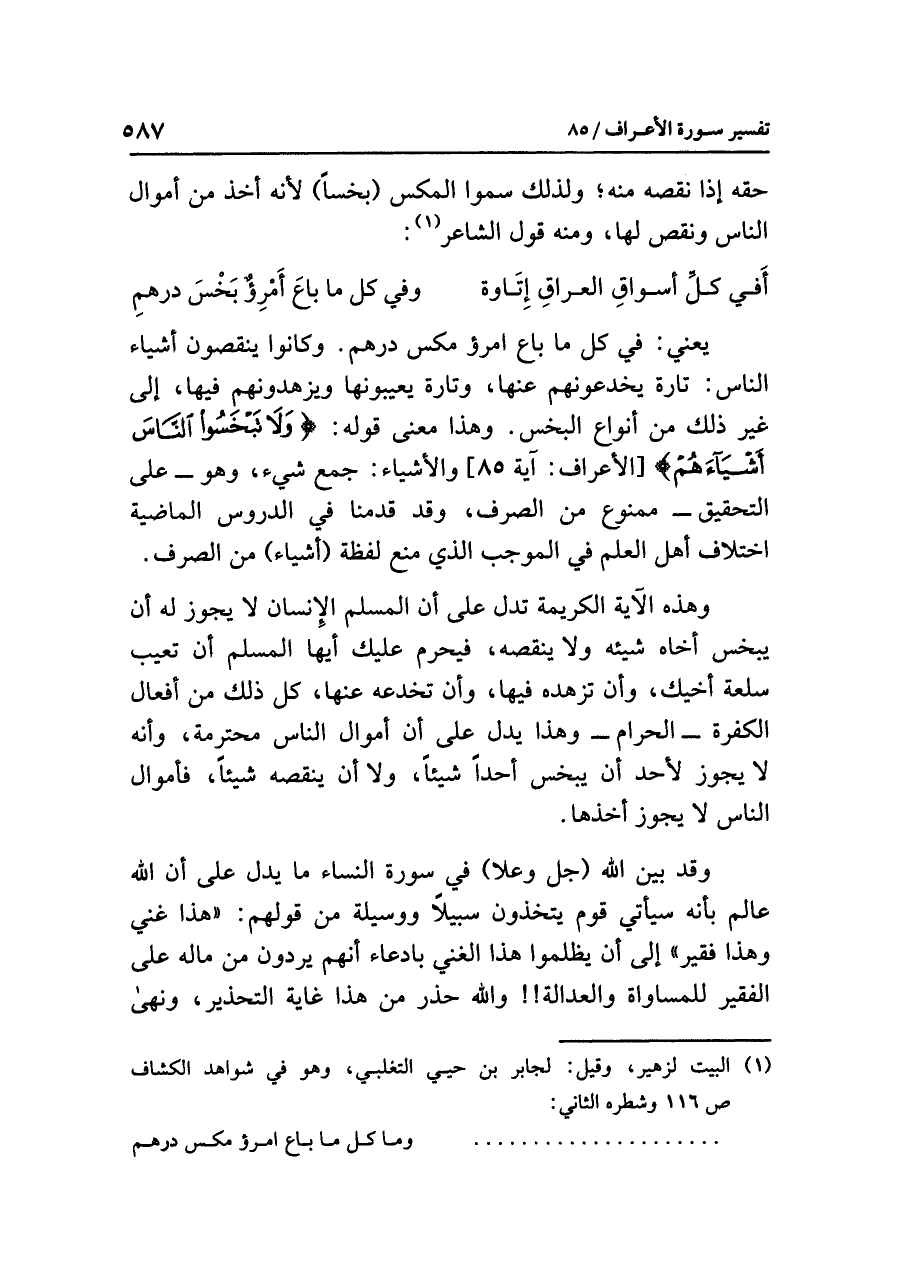 يعنِي: في كُلِّ ما باع امرؤٌ مكس درهم. وكانوا ينقصونَ أشياءَ الناسِ: تارةً يخدعونهم عنها، وتارةً يعيبونَها وَيُزَهِّدُونَهُمْ فيها، إلى غيرِ ذلك من أنواعِ البخسِ. وهذا معنَى قولِه: {وَلَا تَبْخَسُوا النَّاسَ أَشْيَاءَهُمْ} [الأعراف: آية ٨٥] والأشياءُ: جمعُ شيءٍ، وهو - على التحقيقِ - ممنوعٌ من الصرفِ، وقد قَدَّمْنَا اختلافَ أهلِ العلمِ في الموجبِ الذي مَنَعَ لفظةَ (أشياء) من الصرفِ.