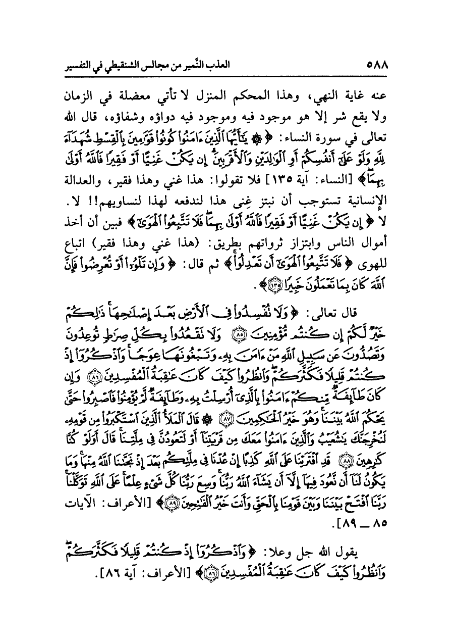 عنه غايةَ النهيِ، وهذا المحكمُ المنزلُ لَا تأتِي معضلةٌ في الزمانِ ولا يقعُ شَرٌّ إلا هو موجودٌ فيه وموجودٌ فيه دَوَاؤُهُ وَشِفَاؤُهُ، قال اللَّهُ تعالى في سورةِ النساءِ: {يأَيُّهَا الَّذِينَ آمَنُوا كُونُوا قَوَّامِينَ بِالْقِسْطِ شُهَدَاءَ لِلَّهِ وَلَوْ عَلَى أَنْفُسِكُمْ أَوِ الْوَالِدَيْنِ وَالأَقْرَبِينَ إِنْ يَكُنْ غَنِيًّا أَوْ فَقَيرًا فَاللَّهُ أَوْلَى بِهِمَا} [النساء: آية ١٣٥] فلا تقولوا: هذا غَنِيٌّ وهذا فقيرٌ، والعدالةُ الإنسانيةُ تستوجبُ أن نَبْتَزَّ غِنَى هذا لندفعَه لهذا لنساويهم!! لَا. لَا {إِنْ يَكُنْ غَنِيًّا أَوْ فَقَيرًا فَاللَّهُ أَوْلَى بِهِمَا فَلَا تَتَّبِعُوا الْهَوَى} فَبَيَّنَ أن أخذَ أموالِ الناسِ وابتزازَ ثرواتِهم بطريقِ: (هذا غَنِيٌّ وهذا فقيرٌ) اتِّبَاعٌ للهوى {فَلَا تَتَّبِعُوا الْهَوَى أَنْ تَعْدِلُوا} ثم قال: {وَإِنْ تَلْوُوا أَوْ تُعْرِضُوا فَإِنَّ اللَّهَ كَانَ بِمَا تَعْمَلُونَ خَبِيرًا}.