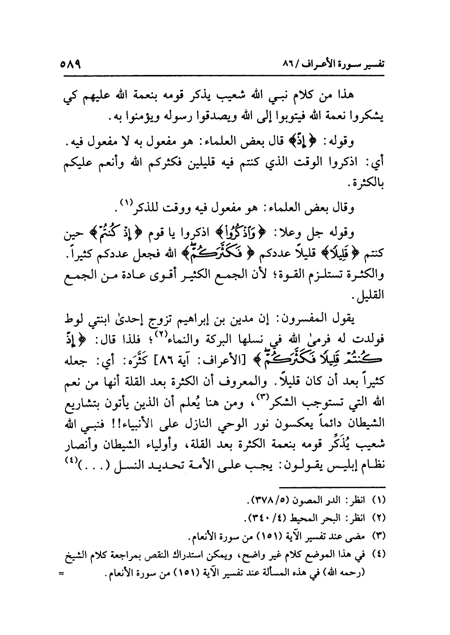 يقولُ المفسرونَ: إن مَدْيَنَ بنَ إبراهيمَ تَزَوَّجَ إحدى ابْنَتَيْ لوطٍ فولدت له فَرَمَى اللَّهُ في نسلِها البركةَ والنماءَ (¬٢)؛ فلذا قال: {وَاذْكُرُوا إِذْ كُنْتُمْ قَلِيلاً فَكَثَّرَكُمْ} [الأعراف: آية ٨٦] كَثَّرَهُ: أي: جَعَلَهُ كثيرًا بعدَ أن كان قليلاً. والمعروفُ أن الكثرةَ بعدَ القلةِ أنها من نِعَمِ اللَّهِ التي تَسْتَوْجِبُ الشكرَ (¬٣)، ومن هنا يعلمُ أن الذين يأتونَ بتشاريعِ الشيطانِ دائمًا يعكسونَ نورَ الوحيِ النازلِ على الأنبياءِ!! فَنَبِيُّ اللَّهِ شعيبٌ يذَكِّرُ قومَه بنعمةِ الكثرةِ بعدَ القلةِ، وأولياءُ الشيطانِ وأنصارُ نظامِ إبليسَ يقولونَ: يجبُ على الأُمَّةِ تحديدُ النسلِ ( ... ) (¬٤)