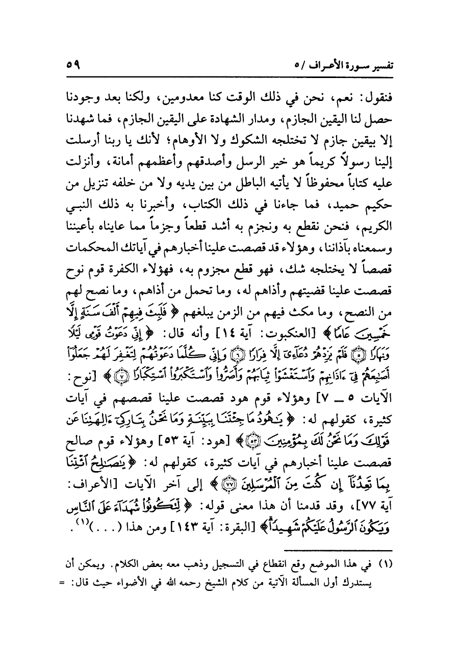 فنقول: نعم، نحن في ذلك الوقت كنا معدومين، ولكنا بعد وجودنا حصل لنا اليقين الجازم، ومدار الشهادة على اليقين الجازم، فما شهدنا إلا بيقين جازم لا تختلجه الشكوك ولا الأوهام؛ لأنك يا ربنا أرسلت إلينا رسولاً كريماً هو خير الرسل وأصدقهم وأعظمهم أمانة، وأنزلت عليه كتاباً محفوظاً لا يأتيه الباطل من بين يديه ولا من خلفه تنزيل من حكيم حميد، فما جاءنا في ذلك الكتاب، وأخبرنا به ذلك النبي الكريم، فنحن نقطع به ونجزم به أشد قطعاً وجزماً مما عايناه بأعْيُنِنَا وسمعناه بآذاننا، وهؤلاء قد قصصت علينا أخبارهم في آياتك المحكمات قصصاً لا يختلجه شك، فهو قطع مجزوم به، فهؤلاء الكفرة قوم نوح قصصت علينا قضيتهم وأذاهم له، وما تحمل من أذاهم، وما نصح لهم من النصح، وما مكث فيهم من الزمن يبلغهم {فَلَبِثَ فِيهِمْ أَلْفَ سَنَةٍ إِلَاّ خَمْسِينَ عَاماً} [العنكبوت: آية ١٤] وأنه قال: {إِنِّي دَعَوْتُ قَوْمِي لَيْلاً وَنَهَاراً (٥) فَلَمْ يَزِدْهُمْ دُعَائِي إِلَاّ فِرَاراً (٦) وَإِنِّي كُلَّمَا دَعَوْتُهُمْ لِتَغْفِرَ لَهُمْ جَعَلُوا أَصَابِعَهُمْ فِي آذَانِهِمْ وَاسْتَغْشَوْا ثِيَابَهُمْ وَأَصَرُّوا وَاسْتَكْبَرُوا اسْتِكْبَاراً (٧)} [نوح: الآيات ٥ - ٧] وهؤلاء قوم هود قصصت علينا قصصهم في آيات كثيرة، كقولهم له: {يَا هُودُ مَا جِئْتَنَا بِبَيِّنَةٍ وَمَا نَحْنُ بِتَارِكِي آلِهَتِنَا عَن قَوْلِكَ وَمَا نَحْنُ لَكَ بِمُؤْمِنِينَ} [هود: آية ٥٣] وهؤلاء قوم صالح قصصت علينا أخبارهم في آيات كثيرة، كقولهم له: {يَا صَالِحُ ائْتِنَا بِمَا تَعِدُنَا إِن كُنتَ مِنَ الْمُرْسَلِينَ} إلى آخر الآيات [الأعراف: آية ٧٧]، وقد قدمنا أن هذا معنى قوله: {لِّتَكُونُواْ شُهَدَاء عَلَى النَّاسِ وَيَكُونَ الرَّسُولُ عَلَيْكُمْ شَهِيداً} [البقرة: آية ١٤٣] ومن هذا ( ... ) (¬١).