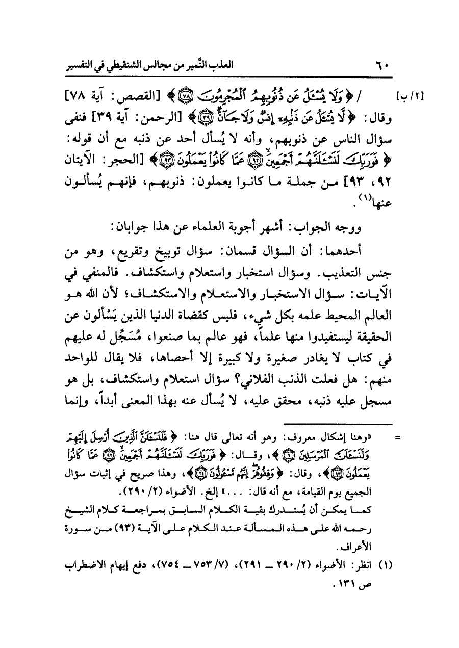 [٢/ب] / {وَلَا يُسْأَلُ عَن ذُنُوبِهِمُ الْمُجْرِمُونَ} [القصص: آية ٧٨] وقال: {لَا يُسْأَلُ عَن ذَنبِهِ إِنسٌ وَلَا جَانٌّ} [الرحمن: آية ٣٩] فنفى سؤال الناس عن ذنوبهم، وأنه لا يُسأل أحد عن ذنبه مع أن قوله: {فَوَرَبِّكَ لَنَسْأَلَنَّهُمْ أَجْمَعِيْنَ (٩٢) عَمَّا كَانُوا يَعْمَلُونَ (٩٣)} [الحجر: الآيتان ٩٢، ٩٣] من جملة ما كانوا يعملون: ذنوبهم، فإنهم يُسألون عنها (¬١).