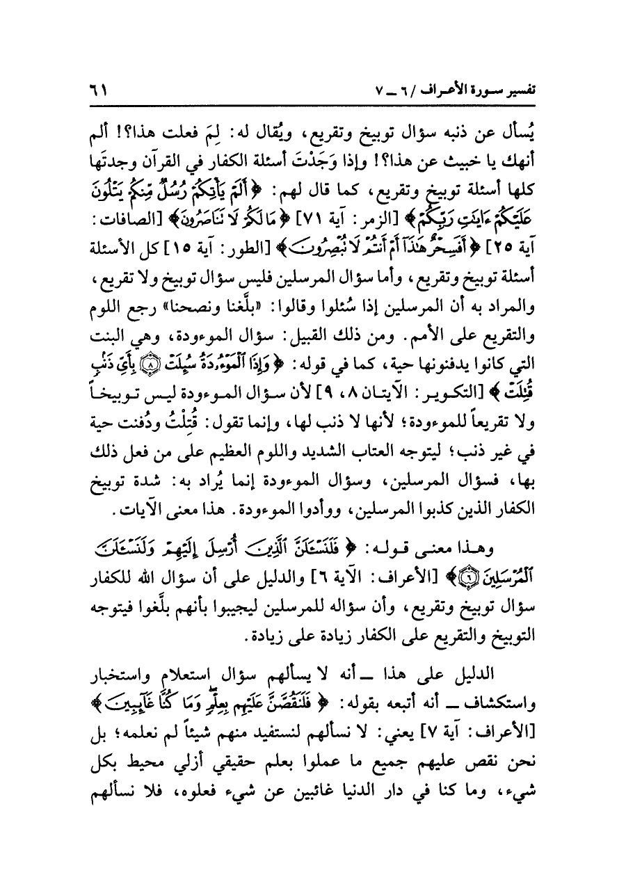 يُسال عن ذنبه سؤال توبيخ وتقريع، ويُقال له: لِمَ فعلت هذا؟! ألم أنهك يا خبيث عن هذا؟! وإذا وَجَدْتَ أسئلة الكفار في القرآن وجدتَها كلها أسئلة توبيخ وتقريع، كما قال لهم: {أَلَمْ يَأْتِكُمْ رُسُلٌ مِّنكُمْ يَتْلُونَ عَلَيْكُمْ آيَاتِ رَبِّكُمْ} [الزمر: آية ٧١] {مَا لَكُمْ لَا تَنَاصَرُونَ} [الصافات: آية ٢٥] {أَفَسِحْرٌ هَذَا أَمْ أَنتُمْ لَا تُبْصِرُونَ} [الطور: آية ١٥] كل الأسئلة أسئلة توبيخ وتقريع، وأما سؤال المرسلين فليس سؤال توبيخ ولا تقريع، والمراد به أن المرسلين إذا سُئلوا وقالوا: (بلَّغنا ونصحنا) رجع اللوم والتقريع على الأمم. ومن ذلك القبيل: سؤال الموءودة، وهي البنت التي كانوا يدفنونها حية، كما في قوله: {وَإِذَا الْمَوْءُودَةُ سُئِلَتْ (٨) بِأَيِّ ذَنبٍ قُتِلَتْ} [التكوير: الآيتان ٨، ٩] لأن سؤال الموءودة ليس توبيخاً ولا تقريعاً للموءودة؛ لأنها لا ذنب لها، وإنما تقول: قُتِلْتُ ودُفنت حية في غير ذنب؛ ليتوجه العتاب الشديد واللوم العظيم على من فعل ذلك بها، فسؤال المرسلين وسؤال الموءودة إنما يُراد به: شدة توبيخ الكفار الذين كذبوا المرسلين، ووأدوا الموءودة. هذا معنى الآيات، وهذا معنى قوله: {فَلَنَسْأَلَنَّ الَّذِينَ أُرْسِلَ إِلَيْهِمْ وَلَنَسْأَلَنَّ الْمُرْسَلِينَ (٦)} [الأعراف: الآية ٦] والدليل على أن سؤال الله للكفار سؤال توبيخ وتقريع، وأن سؤاله للمرسلين ليجيبوا بأنهم بلَّغوا فيتوجه التوبيخ والتقريع على الكفار زيادة على زيادة.