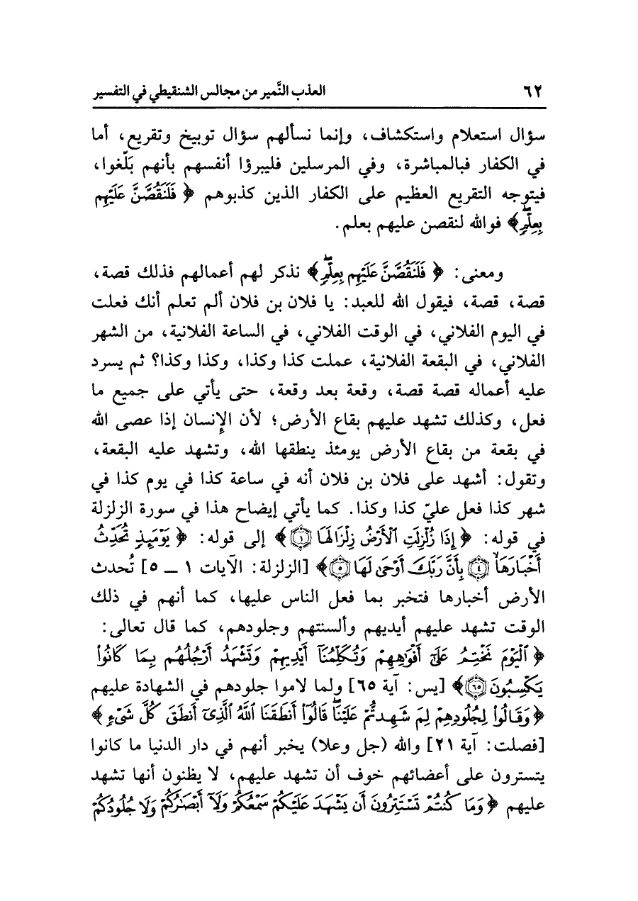كما يأتي إيضاح هذا في سورة الزلزلة في قوله: {إِذَا زُلْزِلَتِ الْأَرْضُ زِلْزَالَهَا (١)} إلى قوله: {يَوْمَئِذٍ تُحَدِّثُ أَخْبَارَهَا (٤) بِأَنَّ رَبَّكَ أَوْحَى لَهَا (٥)} [الزلزلة: الآيات ١ - ٥] تُحدث الأرض أخبارها فتخبر بما فعل الناس عليها، كما أنهم في ذلك الوقت تشهد عليهم أيديهم وألسنتهم وجلودهم، كما قال تعالى: {الْيَوْمَ نَخْتِمُ عَلَى أَفْوَاهِهِمْ وَتُكَلِّمُنَا أَيْدِيهِمْ وَتَشْهَدُ أَرْجُلُهُمْ بِمَا كَانُوا يَكْسِبُونَ (٦٥)} [يس: آية ٦٥] ولما لاموا جلودهم في الشهادة عليهم {وَقَالُوا لِجُلُودِهِمْ لِمَ شَهِدتُّمْ عَلَيْنَا قَالُوا أَنطَقَنَا اللهُ الَّذِي أَنطَقَ كُلَّ شَيْءٍ} [فصلت: آية ٢١] والله (جل وعلا) يخبر أنهم في دار الدنيا ما كانوا يتسترون على أعضائهم خوف أن تشهد عليهم، لا يظنون أنها تشهد عليهم {وَمَا كُنتُمْ تَسْتَتِرُونَ أَنْ يَشْهَدَ عَلَيْكُمْ سَمْعُكُمْ وَلَا أَبْصَارُكُمْ وَلَا جُلُودُكُمْ