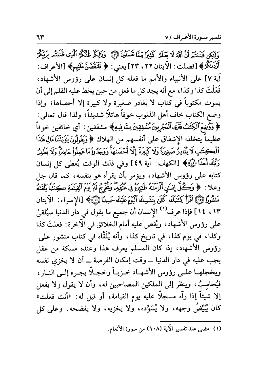 وَلَكِن ظَنَنتُمْ أَنَّ الله لَا يَعْلَمُ كَثِيراً مِّمَّا تَعْمَلُونَ (٢٢) وَذَلِكُمْ ظَنُّكُمُ الَّذِي ظَنَنتُم بِرَبِّكُمْ أَرْدَاكُمْ} [فصلت: الآيتان ٢٢، ٢٣] يعني: {فَلَنَقُصَّنَّ عَلَيْهِم} [الأعراف: آية ٧] على الأنبياء والأمم ما فَعَلَهُ كلّ إِنْسان على رؤوس الأشهاد، فَعَلْتَ كذا وكذا، مع أنه يجد كل ما فعل من حين يخط عليه القلم إلى أن يموت مكتوباً في كتاب لا يغادر صغيرة ولا كبيرة إلا أحصاها؛ وإذا وضع الكتاب خاف أهل الذنوب خوفاً هائلاً شديداً؛ ولذا قال تعالى: {وَوُضِعَ الْكِتَابُ فَتَرَى الْمُجْرِمِينَ مُشْفِقِينَ مِمَّا فِيهِ} مشفقين: أي خائفين خوفاً عظيماً يتخلَّلُه الإشفاق على أنفسهم من الهلاك {وَيَقُولُونَ يَا وَيْلَتَنَا مَالِ هَذَا الْكِتَابِ لَا يُغَادِرُ صَغِيرَةً وَلَا كَبِيرَةً إِلَاّ أَحْصَاهَا وَوَجَدُوا مَا عَمِلُوا حَاضِراً وَلَا يَظْلِمُ رَبُّكَ أَحَداً} [الكهف: آية ٤٩] وفي ذلك الوقت يُعطى كل إنسان كتابه على رؤوس الأشهاد، ويؤمر بأن يقرأه هو بنفسه، كما قال جل وعلا: {وَكُلَّ إِنسَانٍ أَلْزَمْنَاهُ طَآئِرَهُ فِي عُنُقِهِ وَنُخْرِجُ لَهُ