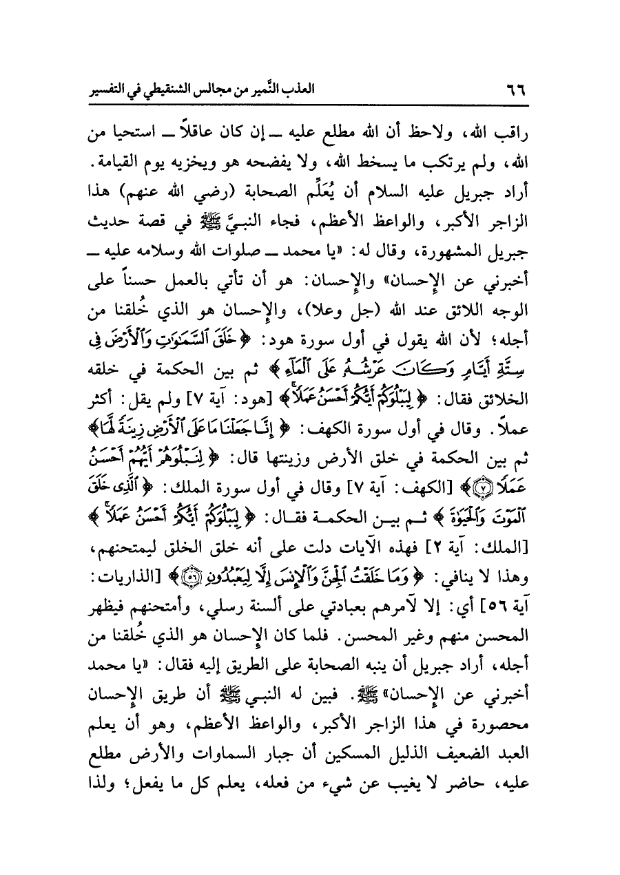 أراد جبريل عليه السلام أن يُعَلِّم الصحابة (رضي الله عنهم) هذا الزاجر الأكبر، والواعظ الأعظم، فجاء النبيَّ صلى الله عليه وسلم في قصة حديث جبريل المشهورة، وقال له: «يا محمد - صلوات الله وسلامه عليه - أخبرني عن الإحسان» والإحسان: هو أن تأتي بالعمل حسناً على الوجه اللائق عند الله (جل وعلا)، والإحسان هو الذي خُلقنا من أجله؛ لأن الله يقول في أول سورة هود: {خَلَق السَّمَاوَاتِ وَالأَرْضَ فِي سِتَّةِ أَيَّامٍ وَكَانَ عَرْشُهُ عَلَى الْمَاء} ثم بين الحكمة في خلقه الخلائق فقال: {لِيَبْلُوَكُمْ أَيُّكُمْ أَحْسَنُ عَمَلاً} [هود: آية ٧] ولم يقل: أكثر عملاً. وقال في أول سورة الكهف: {إِنَّا جَعَلْنَا مَا عَلَى الْأَرْضِ زِينَةً لَّهَا} ثم بين الحكمة في خلق الأرض وزينتها قال: {لِنَبْلُوَهُمْ أَيُّهُمْ أَحْسَنُ عَمَلاً} [الكهف: آية ٧] وقال في أول سورة الملك: {الَّذِي خَلَقَ الْمَوْتَ وَالْحَيَاةَ} ثم بين الحكمة فقال: {لِيَبْلُوَكُمْ أَيُّكُمْ أَحْسَنُ عَمَلاً} [الملك: آية ٢] فهذه الآيات دلت على أنه خلق الخلق ليمتحنهم، وهذا لا ينافي: {وَمَا خَلَقْتُ الْجِنَّ وَالْإِنسَ إِلَاّ لِيَعْبُدُونِ (٥٦)} [الذاريات: آية ٥٦] أي: إلا لآمُرَهُمْ بِعِبَادَتِي عَلَى ألسنة رسلي، وأمتحنهم فيظهر المحسن منهم وغير المحسن، فلما كان الإحسان هو الذي خُلقنا من أجله، أراد جبريل أن ينبه الصحابة على الطريق إليه فقال: «يا محمد أخبرني عن الإحسان» صلى الله عليه وسلم، فبين له النبي صلى الله عليه وسلم أن طريق الإحسان محصورة في هذا الزاجر الأكبر، والواعظ الأعظم، وهو أن يعلم العبد الضعيف الذليل المسكين أن جبار السماوات والأرض مطلع عليه، حاضر لا يغيب عن شيء من فعله، يعلم كل ما يفعل؛ ولذا
