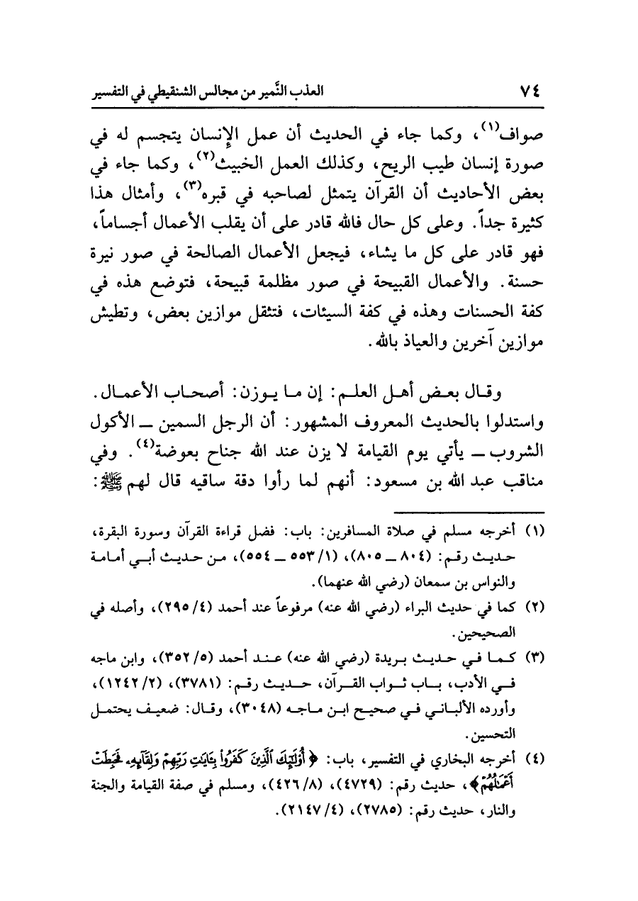 وقال بعض أهل العلم: إن ما يوزن أصحاب الأعمال، واستدلوا بالحديث المعروف المشهور: أن الرجل السمين -الأكول الشروب- يأتي يوم القيامة لا يزن عند الله جناح بعوضة (¬٤)، وفي مناقب عبد الله بن مسعود: أنهم لما رأوا دقة ساقيه قال لهم صلى الله عليه وسلم: