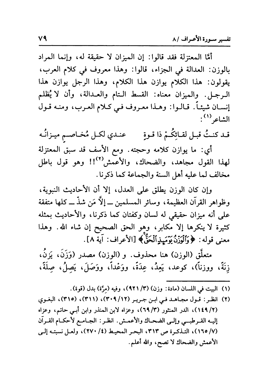 أمَّا المعتزلة فقد قالوا: إن الميزان لا حقيقة له، وإنما المراد بالوزن: العدالة في الجزاء، قالوا: وهذا معروف في كلام العرب، يقولون: هذا الكلام يوازن هذا الكلام، وهذا الرجل يوازن هذا الرجل. والميزان معناه: القسط التام والعدالة، وأن لا يُظلم إنسان شيئاً. قالوا: وهذا معروف في كلام العرب، ومنه قول الشاعر (¬١):