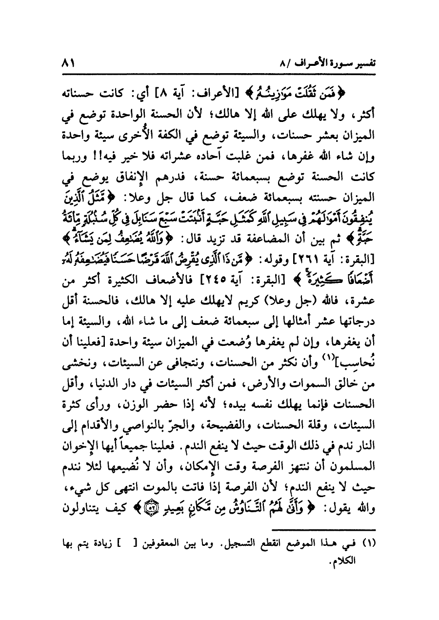 {فَمَن ثَقُلَتْ مَوَازِينُهُ} [الأعراف: آية ٨] أي: كانت حسناته أكثر، ولا يهلك على الله إلا هالك؛ لأن الحسنة الواحدة توضع في الميزان بعشر حسنات، والسيئة توضع في الكفة الأخرى سيئة واحدة وإن شاء الله غفرها، فمن غلبت آحاده عشراته فلا خير فيه!! وربما كانت الحسنة توضع بسبعمائة حسنة، فدرهم الإنفاق يوضع بالميزان حسنته بسبعمائة ضعف، كما قال جل وعلا: {مَّثَلُ الَّذِينَ يُنفِقُونَ أَمْوَالَهُمْ فِي سَبِيلِ الله كَمَثَلِ حَبَّةٍ أَنبَتَتْ سَبْعَ سَنَابِلَ فِي كُلِّ سُنبُلَةٍ مِّئَةُ حَبَّةٍ} ثم بين أن المضاعفة قد تزيد قال: {وَالله يُضَاعِفُ لِمَن يَشَاءُ} [البقرة: آية ٢٦١] وقوله: {مَّن ذَا الَّذِي يُقْرِضُ الله قَرْضاً حَسَناً فَيُضَاعِفَهُ لَهُ أَضْعَافاً كَثِيرَةً} [البقرة: آية ٢٤٥] فالأضعاف الكثيرة أكثر من عشرة، فالله (جل وعلا) كريم لا يهلك عليه إلا هالك، فالحسنة أقل درجاتها عشر أمثالها إلى سبعمائة ضعف إلى ما شاء الله، والسيئة إما أن يغفرها، وإن لم يغفرها وُضعت في الميزان سيئة واحدة [فعلينا أن نُحاسِب] (¬١) وأن نكثر من الحسنات، ونتجافى عن السيئات، ونخشى من خالق السماوات والأرض، فمن أكثر السيئات في دار الدنيا، وأقل الحسنات فإنما يهلك نفسه بيده؛ لأنه إذا حضر الوزن، ورأى كثرة السيئات، وقلة الحسنات، والفضيحة، والجرّ بالنواصي والأقدام إلى النار ندم في ذلك الوقت حيث لا ينفع الندم، فعلينا جميعاً أيها الإخوان المسلمون أن ننتهز الفرصة وقت الإمكان، وأن لا نُضيعها لئلا نندم حيث لا ينفع الندم؛ لأن الفرصة إذا فاتت بالموت انتهى كل شيء، والله يقول: {وَأَنَّى لَهُمُ التَّنَاوُشُ مِن مَكَانٍ بَعِيدٍ} كيف يتناولون