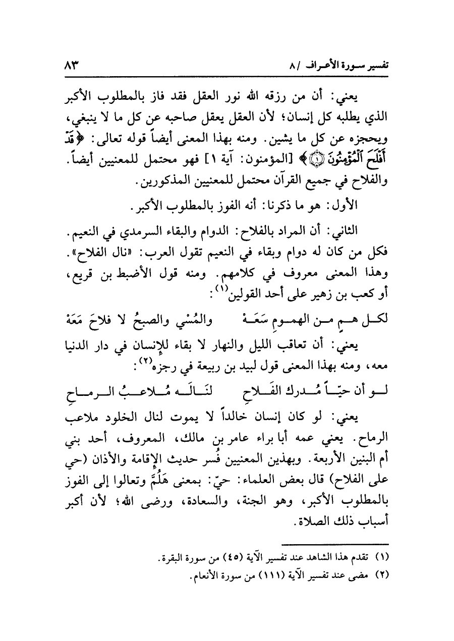 الثاني: أن المراد بالفلاح: الدوام والبقاء السَّرْمَدِي في النعيم، فكل من كان له دوام وبقاء في النعيم تقول العرب: نَالَ الفَلاحَ. وهذا المعْنَى معروف في كلامهم. ومنه قول الأضبط بن قريع، أو كعب بن زهير على أحد القولين (¬١):