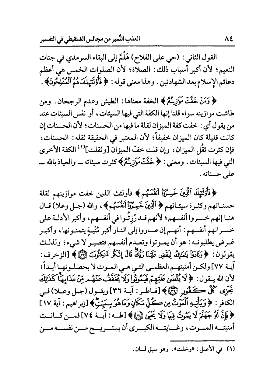 {فَأُوْلَئِكَ الَّذِينَ خَسِرُواْ أَنفُسَهُم} فأولئك الذين خفت موازينهم لقلة حسناتهم وكثرة سيئاتهم {الَّذِينَ خَسِرُواْ أَنفُسَهُم}، والله (جل وعلا) قال هنا إنهم خسروا أنفسهم؛ لأنهم قد رُزِئُوا في أنفسهم، وأكبر الأدلة على خسرانهم أنفسهم: أنهم إن صاروا إلى النار أكبر مُنْيةٍ يتمنونها، وأكبر غرض يطلبونه: هو أن يموتوا وتعدم أنفسهم فتصير لا شيء؛ ولذلك يقولون: {وَنَادَوْا يَا مَالِكُ لِيَقْضِ عَلَيْنَا رَبُّكَ قَالَ إِنَّكُم مَّاكِثُونَ (٧٧)} [الزخرف: آية ٧٧] ولكن أمنيتهم العُظْمَى الَّتِي هِيَ الموت لا يحصلونها أبداً؛ لأن الله يقول: {لَا يُقْضَى عَلَيْهِمْ فَيَمُوتُوا وَلَا يُخَفَّفُ عَنْهُم مِّنْ عَذَابِهَا كَذَلِكَ نَجْزِي كُلَّ كَفُورٍ} [فاطر: آية ٣٦] ويقول (جل وعلا) في الكافر: {وَيَأْتِيهِ الْمَوْتُ مِن كُلِّ مَكَانٍ وَمَا هُوَ بِمَيِّتٍ} [إبراهيم: آية ١٧] {فَإِنَّ لَهُ جَهَنَّمَ لَا يَمُوتُ فِيهَا وَلَا يَحْيى} [طه: آية ٧٤] فمن كانت أمنيته الموت، وغايته الكبرى أن يستريح من نفسه من
