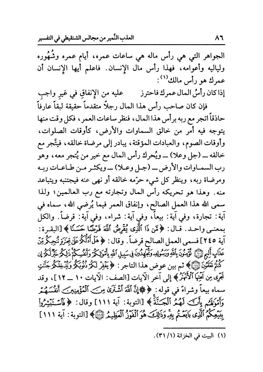 الجواهر التي هي رأس ماله هي ساعات عمره، أيام عمره وشُهُوره ولياليه وأعوامه، فهذا رأس مال الإنسان. فاعلم أيها الإنسان أن عمرك هو رأس مالك (¬١):
