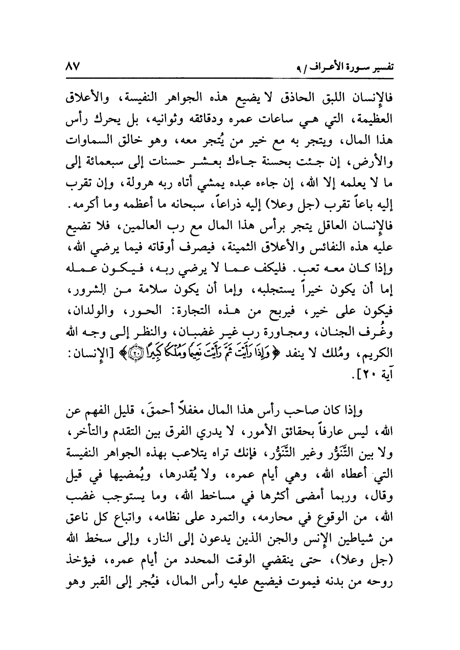 وإذا كان صاحب رأس هذا المال مغفلاً أحْمَقَ، قليل الفهم عن الله، ليس عارفاً بحقائق الأمور، لا يدري الفرق بين التقدم والتأخر، ولا بين التَّنَوُّر وغير التَّنَوُّر، فإنك تراه يتلاعب بهذه الجواهر النفيسة التي أعطاه الله، وهي أيَّام عمره، ولا يُقدرها، ويُمضيها في قيل وقال، وربما أمْضَى أكْثَرَهَا في مساخط الله، وما يستوجب غضب الله، من الوقوع في محارمه، والتمرد على نظامه، واتباع كل ناعق من شياطين الإنس والجن الذين يدعون إلى النار، وإلى سخط الله (جل وعلا)، حتى ينقضي الوقت المحدد من أيام عمره، فيؤخذ روحه من بدنه فيموت فيضيع عليه رأس المال، فيُجر إلى القبر وهو
