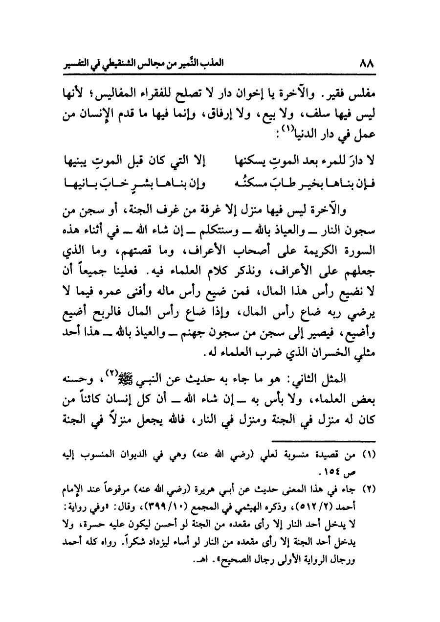 والآخرة ليس فيها منزل إلا غرفة من غرف الجنة، أو سجن من سجون النار -والعياذ بالله- وسنتكلم -إن شاء الله- في أثناء هذه السورة الكريمة على أصحاب الأعراف، وما قصتهم، وما الذي جعلهم على الأعراف، ونذكر كلام العلماء فيه، فعلينا جميعاً أن لا نضيع رأس هذا المال، فَمَنْ ضَيَّعَ رَأْسَ ماله وأفنى عمره فيما لا يرضي ربه ضاع رأس المال، وإذا ضاع رأس المال فالربح أضيع وأضيع، فيصير إلى سجن من سجون جهنم -والعياذ بالله- هذا أحد مثلي الخسران الذي ضرب العلماء له.