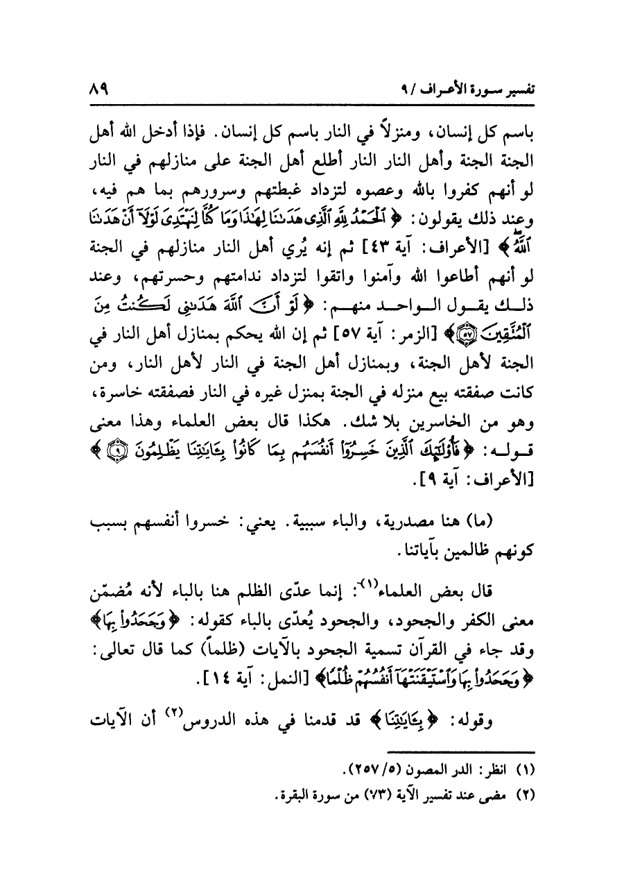 باسم كل إنسان، ومنزلاً في النار باسم كل إنسان. فإذا أدخل الله أهل الجنة الجنة وأهل النار النار أطلع أهل الجنة على منازلهم في النار لو أنهم كفروا بالله وعصوه لتزداد غبطتهم وسرورهم بما هم فيه، وعند ذلك يقولون: {الْحَمْدُ لِلّهِ الَّذِي هَدَانَا لِهَذَا وَمَا كُنَّا لِنَهْتَدِيَ لَوْلا أَنْ هَدَانَا الله} [الأعراف: آية ٤٣] ثم إنه يُري أهل النار منازلهم في الجنة لو أنهم أطاعوا الله وآمنوا واتقوا لتزداد ندامتهم وحسرتهم، وعند ذلك يقول الواحد منهم: {لَوْ أَنَّ الله هَدَانِي لَكُنتُ مِنَ الْمُتَّقِينَ} [الزمر: آية ٥٧] ثم إن الله يحكم بمنازل أهل النار في الجنة لأهل الجنة، وبمنازل أهل الجنة في النار لأهل النار، ومن كانت صفقته بيع منزله في الجنة بمنزل غيره في النار فصفقته خاسرة، وهو من الخاسرين بلا شك. هكذا قال بعض العلماء وهذا معنى قوله: {فَأُوْلَئِكَ الَّذِينَ خَسِرُواْ أَنفُسَهُم بِمَا كَانُواْ بِآيَاتِنَا يِظْلِمُونَ} [الأعراف: آية ٩].