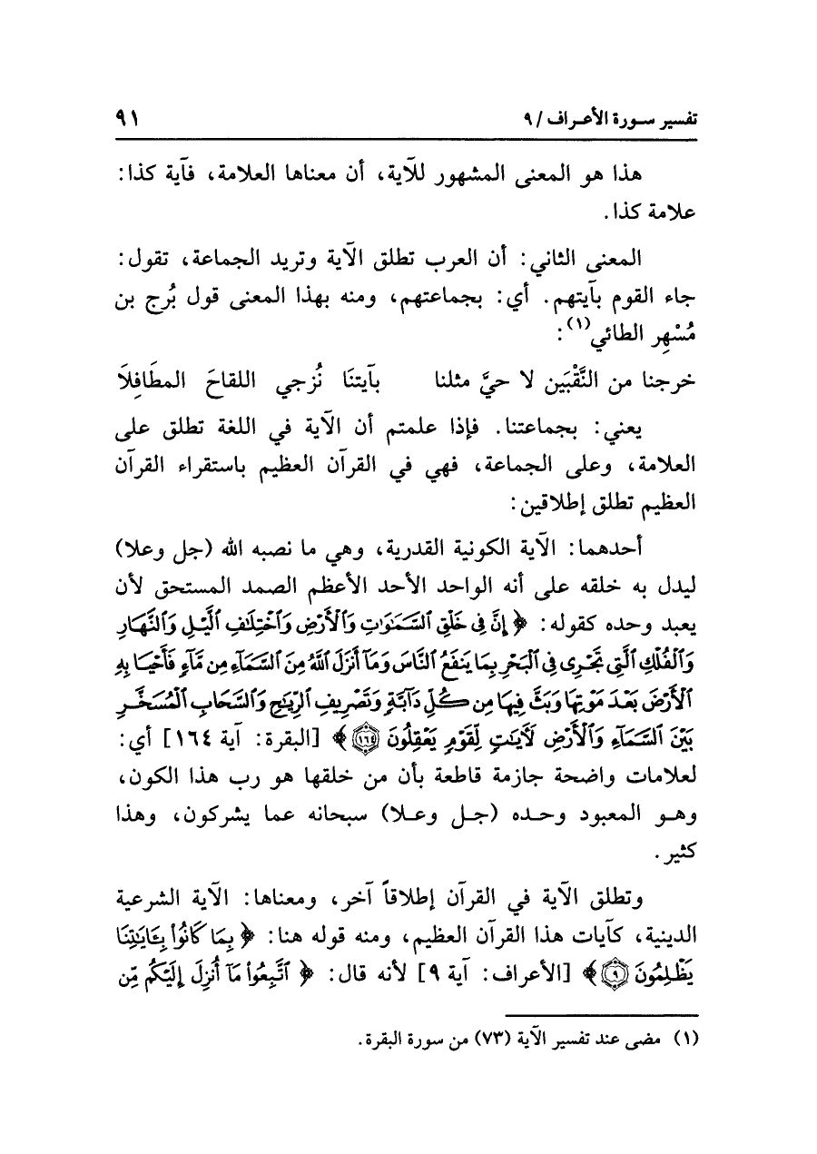 وتطلق الآية في القرآن إطلاقاً آخر، ومعناها: الآية الشَّرْعِيَّة الدينية، كآيات هذا القرآن العظيم، ومنه قوله هنا: {بِمَا كَانُواْ بِآيَاتِنَا يِظْلِمُونَ} [الأعراف: آية ٩] لأنه قال: {اتَّبِعُواْ مَا أُنزِلَ إِلَيْكُم مِّن
