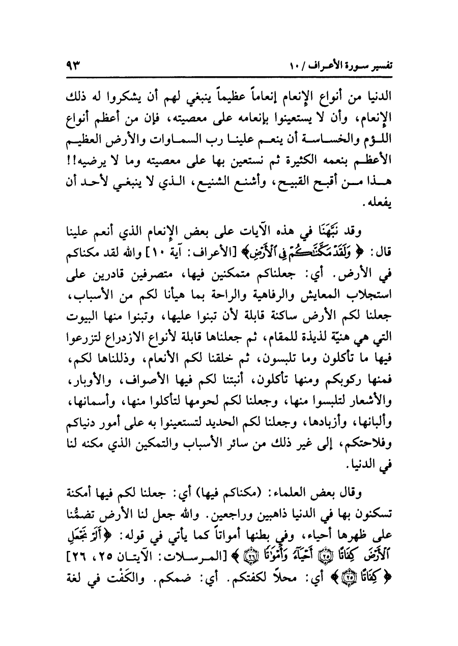 وقد نَبَّهَنَا في هذه الآيات على بعض الإنعام الذي أنعم علينا قال: {وَلَقَدْ مَكَّنَّاكُمْ فِي الأَرْضِ} [الأعراف: آية ١٠] والله لقد مكناكم في الأرض؛ أي: جعلناكم متمَكِّنِينَ فيها، مُتَصَرِّفِين قادرين على استجلاب المعايش والرفاهية والراحة بما هيأنا لكم من الأسباب، جعلنا لكم الأرض ساكنة قابلة؛ لأن تبنوا عليها، وتبنوا منها البيوت التي هي هنيّة لذيذة للمقام، ثم جعلناها قابلة لأنواع الازدراع لتزرعوا فيها ما تأكلون وما تلبسون، ثم خلقنا لكم الأنعام، وذللناها لكم، فمنها ركوبكم ومنها تأكلون، أنبتنا لكم فيها الأصواف والأوبار والأشعار لتلبسوا منها، وجعلنا لكم لحومها لتأكلوا منها، وأسمانها، وألبانها، وأزبادها، وجعلنا لكم الحديد لتستعينوا به على أمور دنياكم وفلاحتكم، إلى غير ذلك من سائر الأسباب والتمكين الذي مكنه لنا في الدنيا.