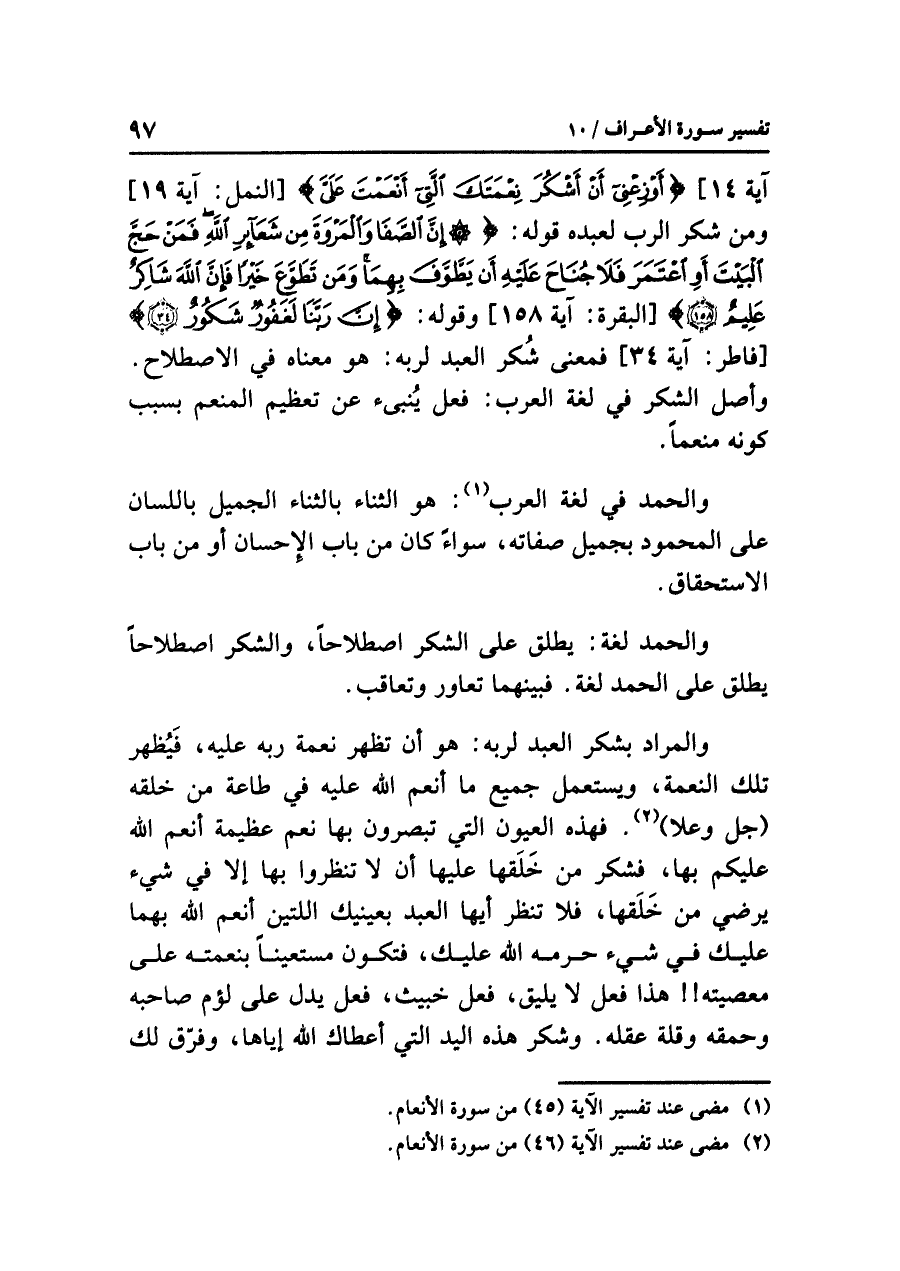 آية ١٤] {أَوْزِعْنِي أَنْ أَشْكُرَ نِعْمَتَكَ الَّتِي أَنْعَمْتَ عَلَيَّ} [النمل: آية ١٩] ومن شكر الرب لعبده قوله: {إِنَّ الصَّفَا وَالْمَرْوَةَ مِن شَعَآئِرِ اللهِ فَمَنْ حَجَّ الْبَيْتَ أَوِ اعْتَمَرَ فَلَا جُنَاحَ عَلَيْهِ أَن يَطَّوَّفَ بِهِمَا وَمَن تَطَوَّعَ خَيْراً فَإِنَّ اللهَ شَاكِرٌ عَلِيمٌ (١٥٨)} [البقرة: آية ١٥٨] وقوله: {إِنَّ رَبَّنَا لَغَفُورٌ شَكُورٌ} [فاطر: آية ٣٤] فمعنى شُكر العبد لربه: هو معناه في الاصطلاح. وأصل الشكر في لغة العرب: فعل يُنبئ عن تعظيم المنعم بسبب كونه مُنْعِماً.