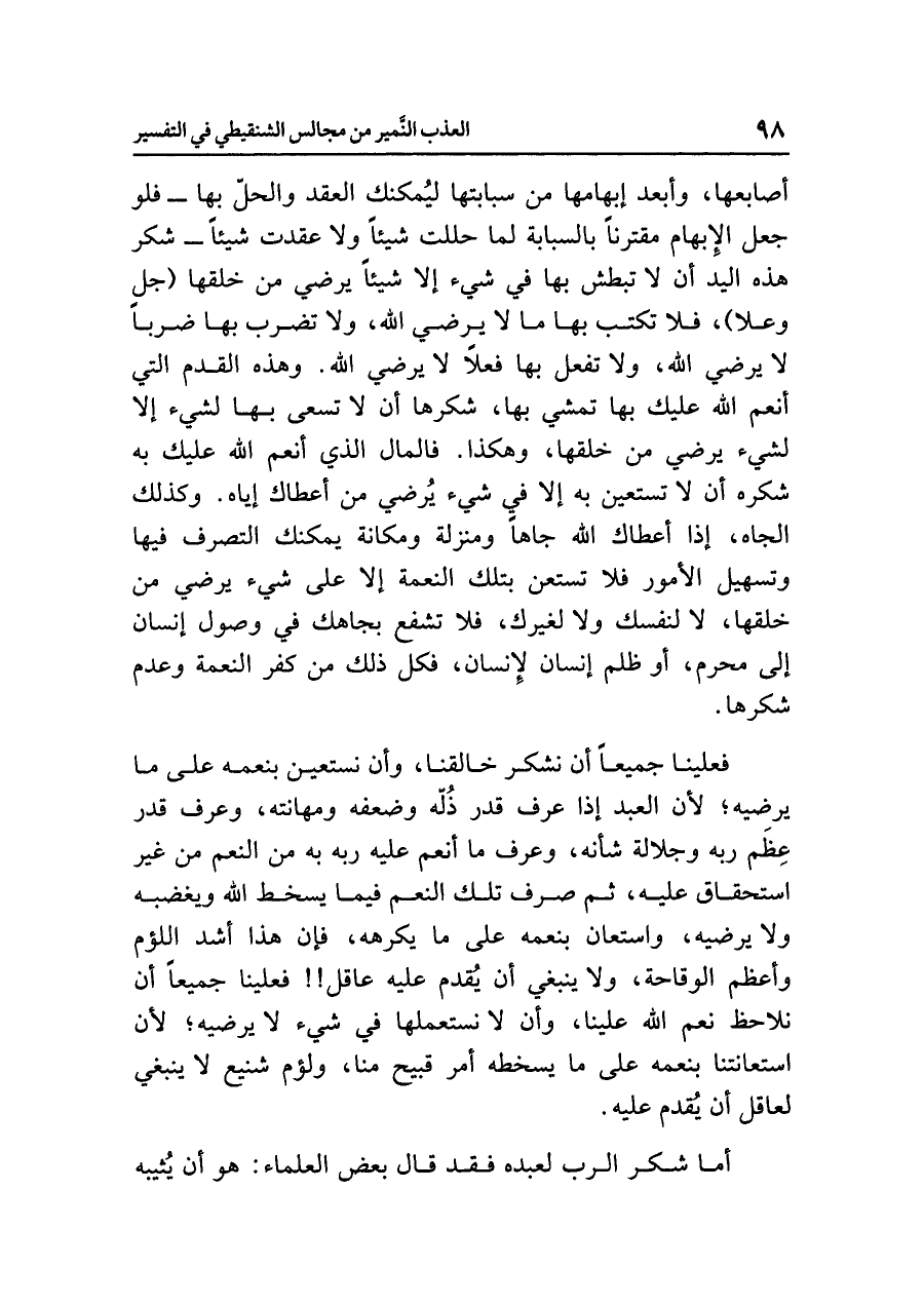 أصابعها، وأبعد إبهامها من سبابتها ليُمكنك العقد والحلّ بها - فلو جعل الإبهام مقترناً بالسبابة لما حللت شيئاً ولا عقدت شيئاً - شكر هذه اليد أن لا تبطش بها في شيء إلا شيئاً يُرْضِي مَنْ خَلَقَهَا (جل وعلا)، فلا تكتب بها ما لا يرضي الله، ولا تضرب بها ضرباً لا يرضي الله، ولا تفعل بها فعلاً لا يرضي الله. وهَذِهِ القَدَمُ الّتي أنْعَمَ الله عليك بها، تمْشِي بها، شُكْرُهَا: أن لا تسعى بها لشيء إلا لشيء يرضي مَنْ خَلَقَها، وهكذا. فالمال الذي أنْعَمَ اللهُ عَلَيْكَ به شُكْرُهُ: أن لا تَسْتَعيِن به إلا في شيء يُرْضِي مَنْ أَعْطَاكَ إِيَّاهُ، وكذلك الجاه، إذا أعطاك اللهُ جَاهاً ومَنْزِلَة ومكانة يمكنك التصرُّف فيها وتسهيل الأمور فلا تَسْتَعِنْ بِتِلْكَ النعمة إلا على شيء يُرْضِي مَنْ خَلَقَهَا، لا لنفسك ولا لغيرك، فلا تشفع بِجَاهِكَ في وصول إنسان إلى محرَّم، أو ظلم إنسان لإنسان، فكل ذلك من كُفْرِ النِّعْمَةِ وعَدَمِ شُكْرِهَا.