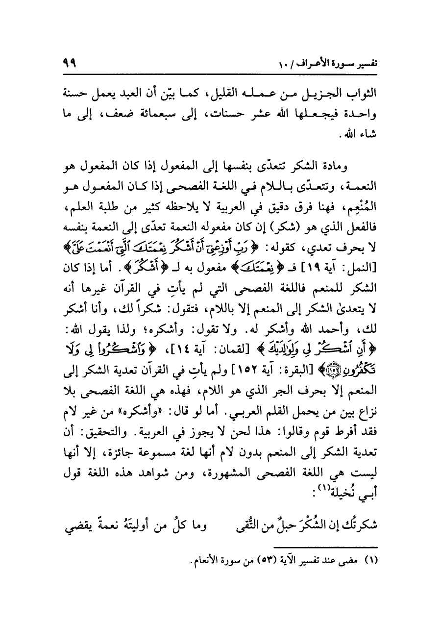 ومادة الشكر تتعدَّى بنفسها إلى المفعول إذا كان المفعول هو النعمة، وتتعدّى باللام في اللغة الفصحى إذا كان المفعول هو المُنْعِم، فهنا فرق دقيق في العربية لا يلاحظه كثير من طلبة العلم، فالفعل الذي هو (شكر) إن كان مفعوله النعمة تعدّى إلى النعمة بنفسه لا بحرف تَعَدٍّ، كقوله: {رَبِّ أَوْزِعْنِي أَنْ أَشْكُرَ نِعْمَتَكَ الَّتِي أَنْعَمْتَ عَلَيَّ} [النمل: آية ١٩] فـ {نِعْمَتَكَ} مفعول به لـ {أَشْكُرَ}. أما إذا كان الشكر للمنعم فاللغة الفصحى التي لم يأتِ في القرآن غيرها أنه لا يتعدى الشكر إلى المنعم إلا باللام، فتقول: شكراً لك، وأنا أشكر لك، وأحمد الله وأشكر له. ولا تقول: وأشكره؛ ولذا يقول الله: {أَنِ اشْكُرْ لِي وَلِوَالِدَيْكَ} [لقمان: آية ١٤] {وَاشْكُرُواْ لِي وَلَا تَكْفُرُونِ} [البقرة: آية ١٥٢] ولم يأتِ في القرآن تعدية الشكر إلى المنعم إلَاّ بحرف الجر الذي هو اللام، فهذه هي اللغة الفصحى بلا نزاع بين من يحمل القلم العربي، أما لو قال: «وأشكره» من غير لام فقد أفرط قوم وقالوا: هذا لحن لا يجوز في العربية، والتحقيق: أن تعدية الشكر إلى المنعم بدون لام أنها لغة مسموعة جائزة، إلا أنها ليست هي اللغة الفصحى المشهورة، ومن شواهد هذه اللغة قول أبي نُخيلة (¬١):