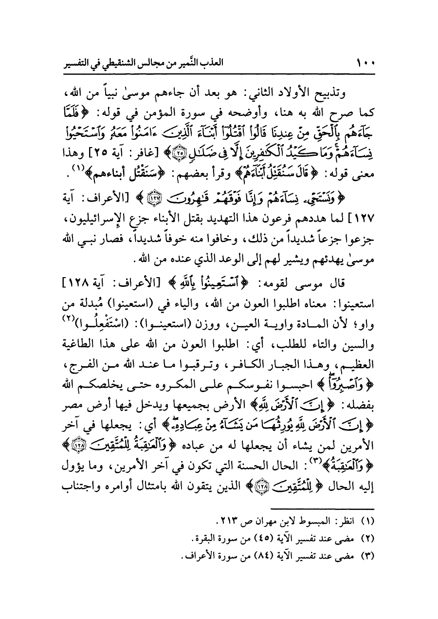 {وَنَسْتَحْيِي نِسَاءهُمْ وَإِنَّا فَوْقَهُمْ قَاهِرُونَ} [الأعراف: آية ١٢٧] لما هددهم فرعون هذا التهديد بقتل الأبناء جزع الإسرائيليون، جزعوا جزعًا شديدًا من ذلك، وخافوا منه خوفًا شديدًا، فصار نبي الله موسى يهدئهم، ويشير لهم إلى الوعد الذي عنده من الله، {قَالَ مُوسَى لِقَوْمِهِ اسْتَعِينُوا بِاللَّهِ} [الأعراف: آية ١٢٨] استعينوا: معناه اطلبوا العون من الله، والياء في (استعينوا) مُبدلة من واو؛ لأن المادة واوية العين، ووزن (استعينوا): (اسْتَفْعِلُوا) (¬٢) والسين والتاء للطلب؛ أي: اطلبوا العَوْن من الله على هذا الطاغية العظيم، وهذا الجبار الكافر، وتَرَقَّبُوا ما عند الله مِنَ الفَرَجِ، {وَاصْبِرُواْ} احبسوا نفوسكم على المكروه حتى يخلصكم الله بفضله: {إِنَّ الأَرْضَ لله} الأرض بجميعها ويدخل فيها أرض مصر {يُورِثُهَا مَن يَشَاءُ مِنْ عِبَادِهِ} أي: يجعلها في آخر الأمرين لمن يشاء أن يجعلها له من عباده {وَالْعَاقِبَةُ لِلْمُتَّقِينَ} {وَالْعَاقِبَةُ} (¬٣): الحال الحسنة التي تكون في آخر الأمرين، وما يؤول إليه الحال {لِلْمُتَّقِينَ} الذين يتقون الله بامتثال أوامره واجتناب