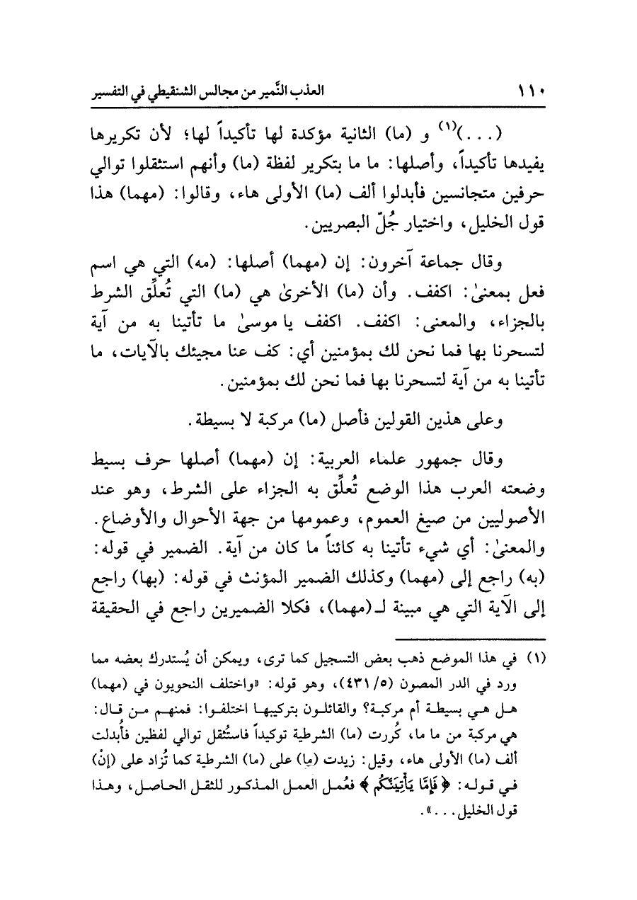( ... ) (¬١) و (ما) الثانية مؤكدة لها تأكيدًا لها؛ لأن تكريرها يفيدها تأكيدًا، وأصلها: ما ما بتكرير لفظة (ما) وأنهم استثقلوا توالي حرفين متجانسين فأبدلوا ألف (ما) الأولى هاء، وقالوا: (مهما) هذا قول الخليل واختيار جلّ البصريين.