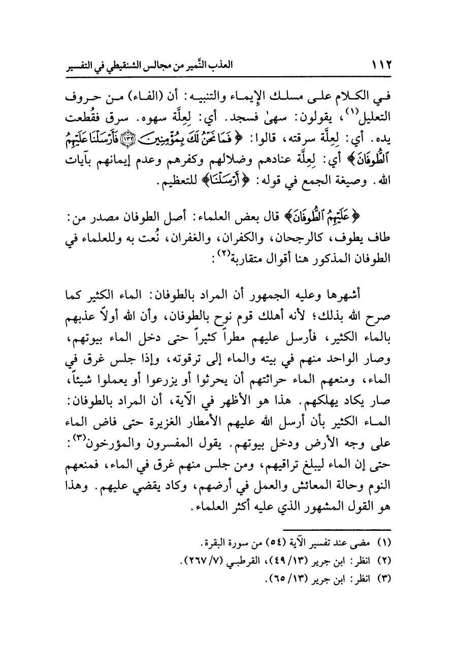 أشهرها وعليه الجمهور أن المراد بالطوفان: الماء الكثير كما صَرَّحَ اللهُ بِذَلِكَ؛ لأنه أهلك قوم نوح بالطوفان، وأن الله أولاً عذبهم بالماء الكثير، فأرسل عليهم مطرًا كثيرًا حتى دخل الماء بيوتهم، وصار الواحد منهم في بيته والماء إلى ترقوتِهِ، وإذا جَلَس غرق في الماء، ومنعهم الماء حراثتهم أن يحرثوا أو يزرعوا أو يعملوا شيئًا، صار يكاد يهلكهم، هذا هو الأظهر في الآية، أن المراد بالطوفان: الماء الكثير بأن أرسل الله عليهم الأمطار الغزيرة حتى فاض الماء على وجه الأرض ودخل بيوتهم. يقول المفسرون والمؤرخون (¬٣): حتى إن الماء ليبلغ تراقيهم، ومن جلس منهم غرق في الماء، فمنعهم النوم وحالة المعائش والعمل في أرضهم، وكاد يقضي عليهم، وهذا هو القول المشهور الذي عليه أكثر العلماء.