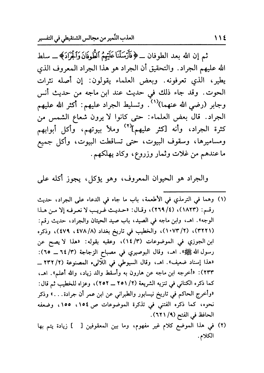 ثم إن الله بعد الطوفان {فَأَرْسَلْنَا عَلَيْهِمُ الطُّوفَانَ وَالْجَرَادَ} سلط الله عليهم الجراد. والتحقيق أن الجراد هو هذا الجراد المعروف الذي يطير الذي تعرفونه. وبعض العلماء يقولون: إن أصله نثرات الحوت. وقد جاء ذلك في حديث عند ابن ماجه من حديث أنس وجابر (رضي الله عنهما) (¬١). وتسليط الجراد عليهم: أكثر الله عليهم الجراد، قال بعض العلماء: حتى كانوا لا يرون شعاع الشمس من كثرة الجراد، وأنه [كثر عليهم] (¬٢) وملأ بيوتهم، وأكل أبوابهم ومساميرها، وسقوف البيوت، حتى تساقطت البيوت، وأكل جميع ما عندهم من غلات وثمار وزروع، وكاد يهلكهم.