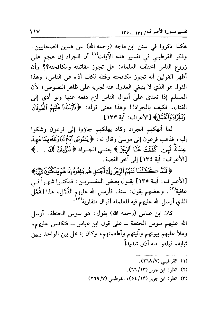 هكذا ذكروا في سنن ابن ماجه (رحمه الله) عن هذين الصحابيين. وذكر القرطبي في تفسير هذه الآيات (¬١) أن الجراد إن هجم على زروع الناس اختلف العلماء: هل تجوز مقاتلته ومكافحته؟ وأن أظهر القولين أنه تجوز مكافحته وقتله لِكَفِّ أذَاهُ عَنِ النَّاسِ، وهذا القول هو الذي لا ينبغي العدول عنه لجريه على ظاهر النصوص؛ لأن المسلم إذا تَعَدَّى على أموال الناس لَزِمَ دَفْعُهُ عَنْهَا ولو أدَّى إِلى القِتَال، فكيف بالجراد؟! وهذا معنى قوله: {فَأَرْسَلْنَا عَلَيْهِمُ الطُّوفَانَ وَالْجَرَادَ وَالْقُمَّلَ} [الأعراف: آية ١٣٣].