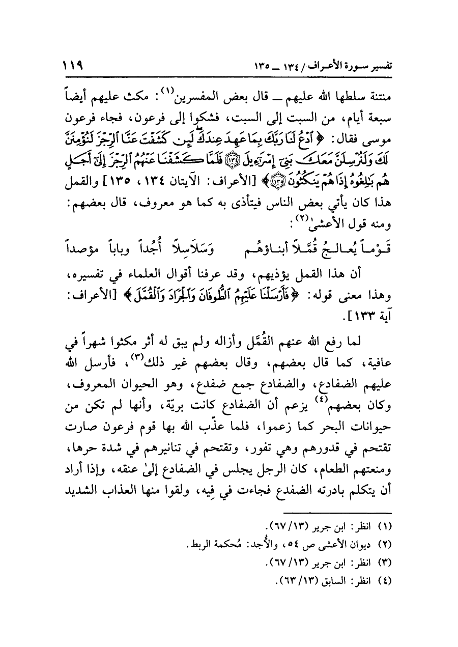 منتنة سلطها الله عليهم- قال بعض المفسرين (¬١): مكث عليهم أيضًا سبعة أيام، من السبت إلى السبت، فشكوا إلى فرعون، فجاء فرعون موسى فقال: {ادْعُ لَنَا رَبَّكَ بِمَا عَهِدَ عِندَكَ لَئِن كَشَفْتَ عَنَّا الرِّجْزَ لَنُؤْمِنَنَّ لَكَ وَلَنُرْسِلَنَّ مَعَكَ بَنِي إِسْرَائِيلَ (١٣٤) فَلَمَّا كَشَفْنَا عَنْهُمُ الرِّجْزَ إِلَى أَجَلٍ هُم بَالِغُوهُ إِذَا هُمْ يَنكُثُونَ (١٣٥)} [الأعراف: الآيتان ١٣٤، ١٣٥] والقمل هذا كان يأتي بعض الناس فيتأذى به كما هو معروف، قال بعضهم: ومنه قول الأعشى (¬٢):