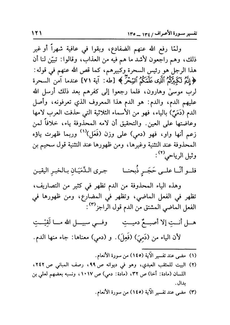 ولمّا رفع الله عنهم الضفادع، وبقوا في عافية شهرًا أو غير ذلك، وهم راجعون لأشد ما هم فيه من العذاب، وقالوا: تبيّن لنا أن هذا الرجل هو رئيس السحرة وكبيرهم، كما قص الله عنهم في قوله: {إِِنَّهُ لَكَبِيرُكُمُ الَّذِي عَلَّمَكُمُ السِّحْرَ} [طه: آية ٧١] عندما آمن السحرة لرب موسى وهارون، فلما رجعوا إلى كفرهم بعد ذلك أرسل الله عليهم الدم، والدم: هو الدم هذا المعروف الذي تعرفونه، وأصل الدم (دَمَيٌ) بالياء، فهو من الأسماء الثلاثية التي حذفت العرب لامها وعاضتها على العين، والتحقيق أن لامه المحذوفة ياء، خلافًا لمن زعم أنها واو، فهو (دمي) على وزن (فَعَل) (¬١) وربما ظهرت ياؤه المحذوفة عند التثنية وغيرها، ومن ظهورها عند التثنية قول سحيم بن وثيل الرياحي (¬٢):