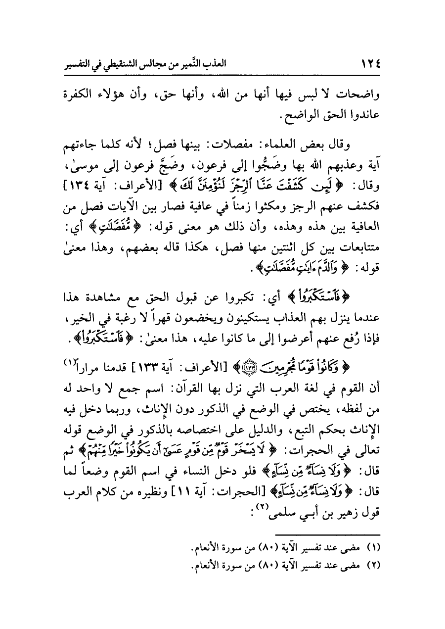 {وَكَانُواْ قَوْمًا مُّجْرِمِينَ} [الأعراف: آية ١٣٣] قدمنا مرارًا (¬١) أن القوم في لغة العرب التي نزل بها القرآن: اسم جمع لا واحد له من لفظه، يختص في الوضع في الذكور دون الإناث، وربما دخل فيه الإناث بحكم التبع، والدليل على اختصاصه بالذكور في الوضع قوله تعالى في الحجرات: {لَا يَسْخَرْ قَومٌ مِّن قَوْمٍ عَسَى أَن يَكُونُوا خَيْرًا مِّنْهُمْ} ثم قال: {وَلَا نِسَاء مِّن نِّسَاءٍ} فلو دخل النساء في اسم القوم وضعًا لما قال: {وَلَا نِسَاء مِّن نِّسَاءٍ} [الحجرات: آية ١١] ونظيره من كلام العرب قول زهير بن أبي سلمى (¬٢):