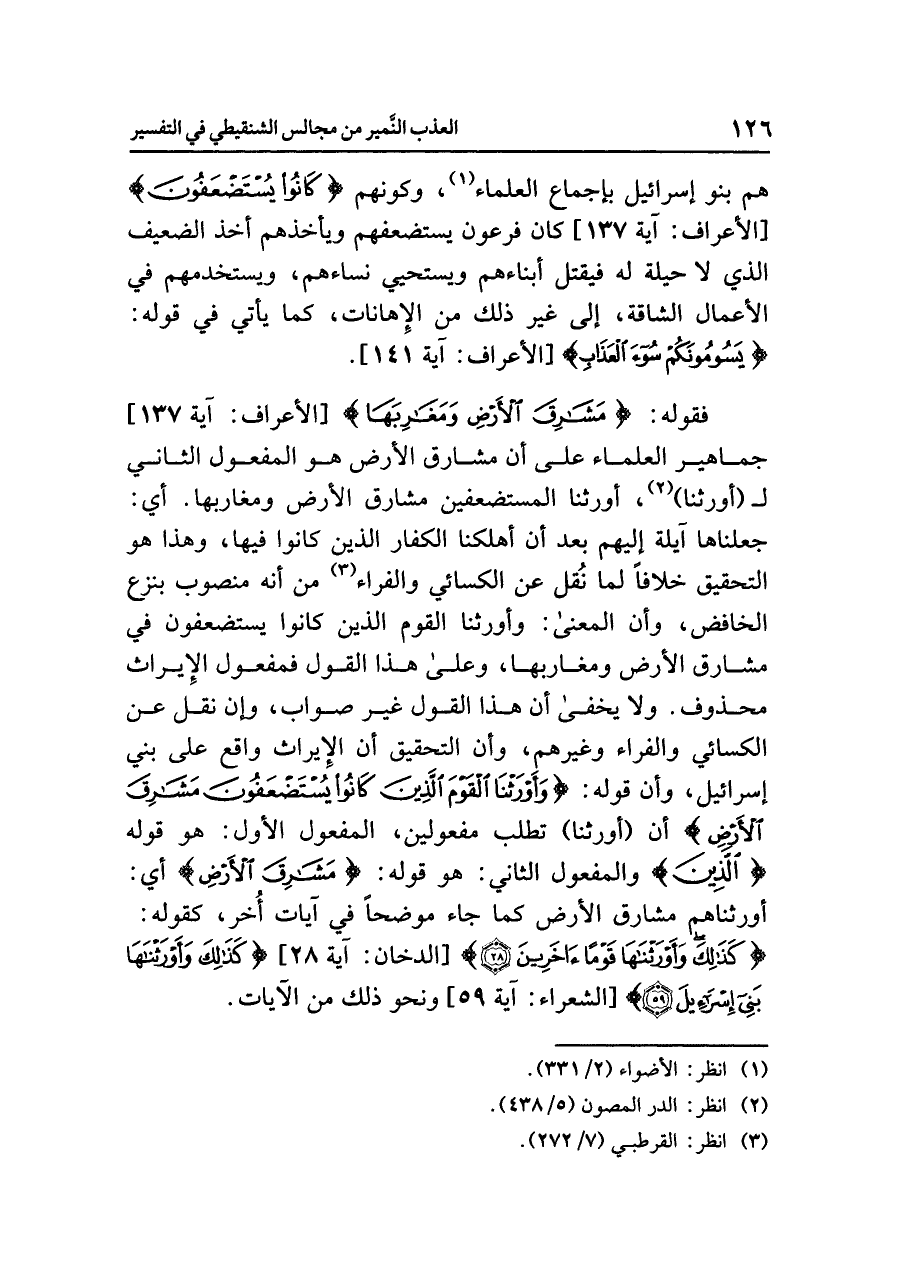 فقوله: {مَشَارِقَ الأَرْضِ وَمَغَارِبَهَا} [الأعراف: آية ١٣٧] جماهير العلماء على أن مشارق الأرض هو المفعول الثاني لـ (أورثنا) (¬٣)، أورثنا المستضعفين مشارق الأرض ومغاربها. أي: جعلناها آيلة إليهم بعد أن أهلكنا الكفار الذين كانوا فيها، وهذا هو التحقيق خلافًا لما نُقل عن الكسائي والفراء (¬٤) مِنْ أنَّهُ مَنْصُوبٌ بِنَزْعِ الخَافِضِ، وأن المعنى: وأوْرَثْنَا القوم الذين كانوا يستضعفون في مشارق الأرض ومغاربها، وعلى هذا القول فمفعول الإيراث محذوف. ولا يخفى أن هذا القول غير صواب، وإن نقل عن الكسائي والفراء وغيرهم، وأن التحقيق أن الإيراث واقع على بني إسرائيل، وأن قوله: {وَأَوْرَثْنَا الْقَوْمَ الَّذِينَ كَانُواْ يُسْتَضْعَفُونَ مَشَارِقَ الأَرْضِ} أن (أورثنا) تطلب مفعولين، المفعول الأول: هو قوله {الَّذِينَ} والمفعول الثاني: هو قوله: {مَشَارِقَ الأَرْضِ} أي: أورثناهم مشارق الأرض كما جاء موضحًا في آيات أُخر، كقوله: {كَذَلِكَ وَأَوْرَثْنَاهَا قَوْمًا آخَرِينَ (٢٨)} [الدخان: آية ٢٨] {كَذَلِكَ وَأَوْرَثْنَاهَا بَنِي إِسْرَائِيلَ (٥٩)} [الشعراء: آية ٥٩] ونحو ذلك من الآيات.