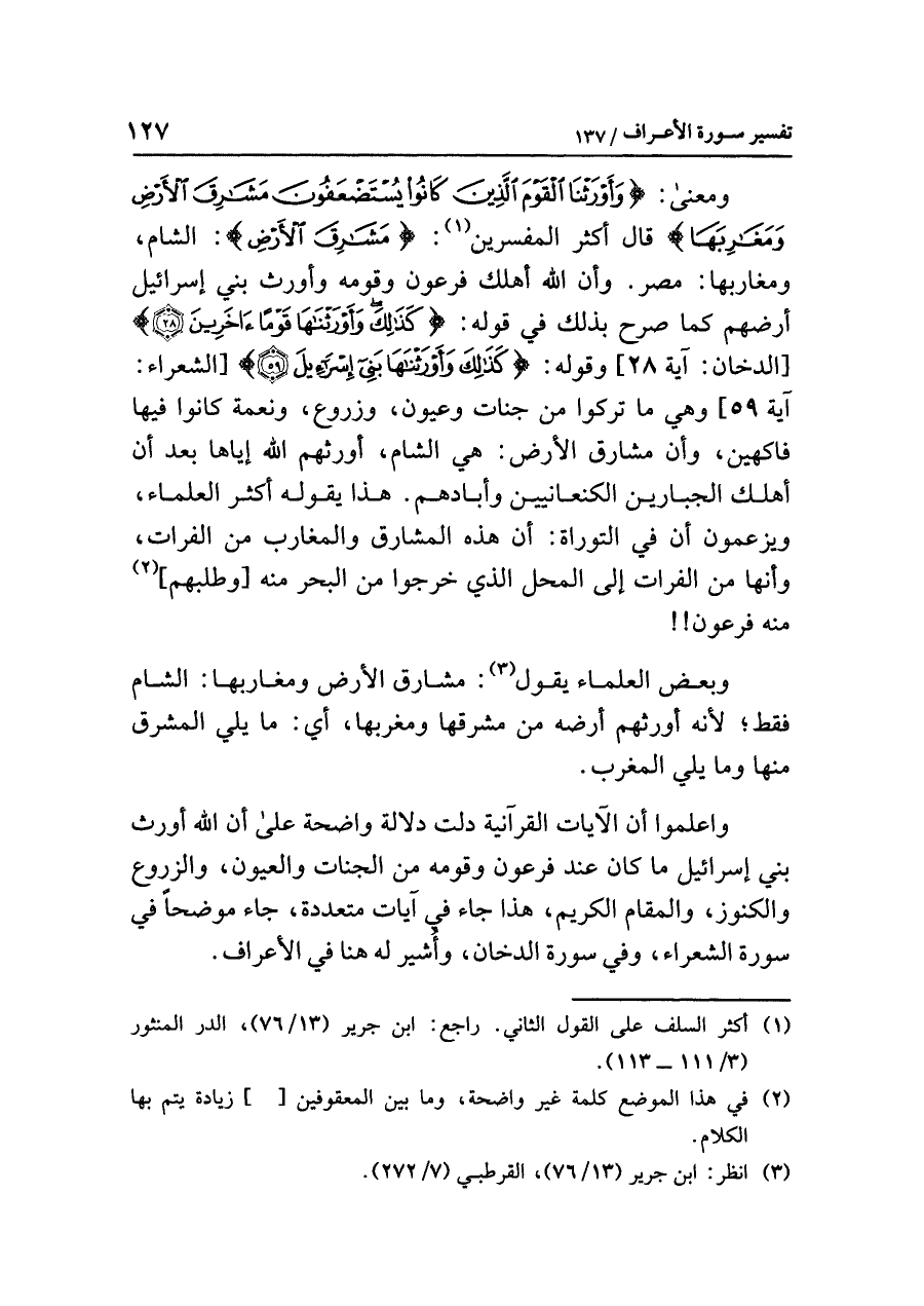 ومعنى: {وَأَوْرَثْنَا الْقَوْمَ الَّذِينَ كَانُواْ يُسْتَضْعَفُونَ مَشَارِقَ الأَرْضِ وَمَغَارِبَهَا} قال أكثر المفسرين (¬١): {مَشَارِقَ الأَرْضِ}: الشام، ومغاربها: مصر. وأن الله أهلك فرعون وقومه وأورث بني إسرائيل أرضهم كما صرح بذلك في قوله: {كَذَلِكَ وَأَوْرَثْنَاهَا قَوْمًا آخَرِينَ (٢٨)} [الدخان: آية ٢٨] وقوله: {كَذَلِكَ وَأَوْرَثْنَاهَا بَنِي إِسْرَائِيلَ (٥٩)} [الشعراء: آية ٥٩] وهي ما تركوا من جنات وعيون، وزروع، ونعمة كانوا فيها فاكهين، وأن مشارق الأرض: هي الشام، أورثهم الله إياها بعد أن أهلك الجبارين الكنعانيين وأبادهم. هذا يقوله أكثر العلماء، ويزعمون أن في التوراة: أن هذه المشارق والمغارب من الفرات، وأنها من الفرات إلى المحل الذي خرجوا من البحر منه [وطلبهم] (¬٢) منه فرعون!!
