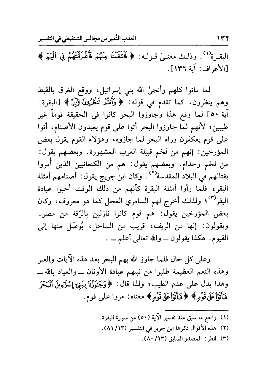 لما ماتوا كلهم وأنجى الله بني إسرائيل، ووقع الغرق بالقبط وهم ينظرون، كما تقدم في قوله: {وَأَنتُمْ تَنظُرُونَ} [البقرة: آية ٥٠] لما وقع هذا وجاوزوا البحر كانوا في الحقيقة قومًا غير طيبين؛ لأنهم لما جاوزوا البحر أتوا على قوم يعبدون الأصنام، أتوا على قوم يعكفون وراء البحر لما جازوه، وهؤلاء القوم يقول بعض المؤرخين: إنهم من لخم قبيلة العرب المشهورة. وبعضهم يقول: من لخم وجذام. وبعضهم يقول: هم من الكنعانيين الذين أُمروا بقتالهم في البلاد المقدسة (¬٢). وكان ابن جريج يقول: أصنامهم أمثلة البقر، فلما رأوا أمثلة البقرة كأنهم من ذلك الوقت أحبوا عبادة البقر (¬٣)؛ ولذلك أخرج لهم السامري العجل كما هو معروف، وكان بعض المؤرخين يقول: هم قوم كانوا نازلين بالرّقة من مصر. ويقولون: إنها من الريف، قريب من الساحل، يُوصَل منها إلى الفيوم. هكذا يقولون. والله تعالى أعلم.