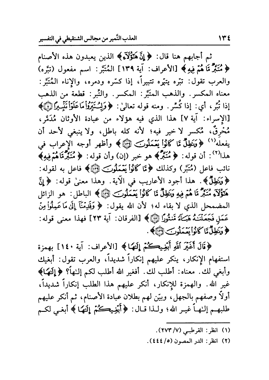 ثم أجابهم هنا قال: {إِنَّ هَؤُلاء} الذين يعبدون هذه الأصنام {مُتَبَّرٌ مَّا هُمْ فِيهِ} [الأعراف: آية ١٣٩] المُتَبَّر: اسم مفعول (تبَّره) والعرب تقول: تبّره يُتَبِّره تتبيرًا: إذا كسّره ودمره، والإناء المُتَبَّر: معناه المكسر. والذهب المُتبَّر: المكسر. والتِّبر: قطعة من الذهب إذا تُبِّر، أي: إذا كُسِّر. ومنه قوله تعالى: {وَلِيُتَبِّرُواْ مَا عَلَوْاْ تَتْبِيرًا} [الإسراء: آية ٧] هذا الذي فيه هؤلاء من عبادة الأوثان مُدَمَّر، مُحْرقٌ، مُكسر لا خير فيه؛ لأنه كله باطل، ولا ينبغي لأحد أن يفعله (¬١) {وَبَاطِلٌ مَّا كَانُواْ يَعْمَلُونَ} وأظهر أوجه الإعراب في هذا (¬٢): أن قوله: {مُتَبَّرٌ} هو خبر (إن) وأن قوله: {مُتَبَّرٌ مَّا هُمْ فِيهِ} نائب فاعل (مُتَبَّر) وكذلك {مَّا كَانُواْ يَعْمَلُونَ} فاعل به لقوله: {وَبَاطِلٌ}. هذا أجود الأعاريب في الآية.