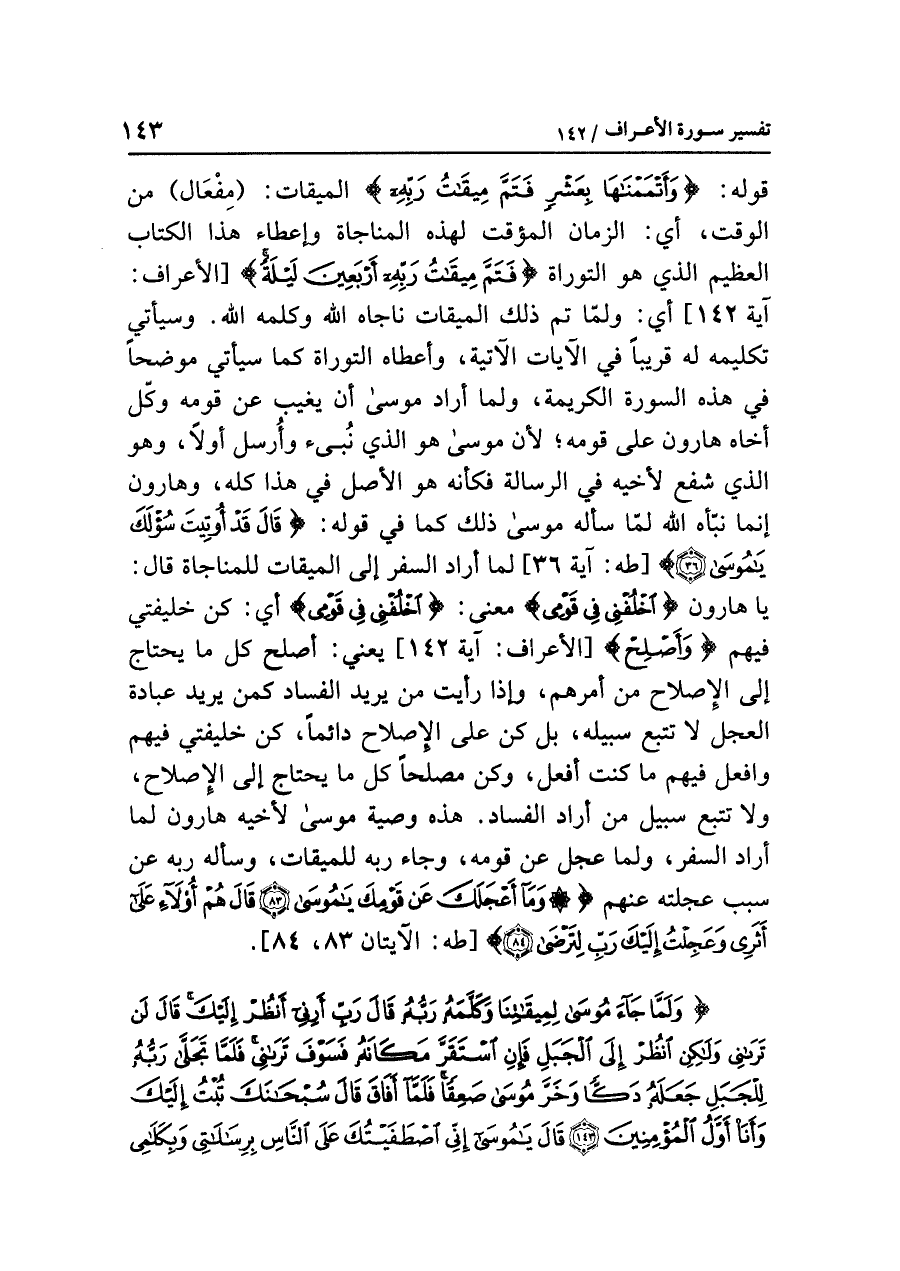 {وَلَمَّا جَاء مُوسَى لِمِيقَاتِنَا وَكَلَّمَهُ رَبُّهُ قَالَ رَبِّ أَرِنِي أَنظُرْ إِلَيْكَ قَالَ لَن تَرَانِي وَلَكِنِ انظُرْ إِلَى الْجَبَلِ فَإِنِ اسْتَقَرَّ مَكَانَهُ فَسَوْفَ تَرَانِي فَلَمَّا تَجَلَّى رَبُّهُ لِلْجَبَلِ جَعَلَهُ دَكًّا وَخَرَّ موسَى صَعِقًا فَلَمَّا أَفَاقَ قَالَ سُبْحَانَكَ تُبْتُ إِلَيْكَ وَأَنَاْ أَوَّلُ الْمُؤْمِنِينَ (١٤٣) قَالَ يَا مُوسَى إِنِّي اصْطَفَيْتُكَ عَلَى النَّاسِ بِرِسَالَاتِي وَبِكَلَامِي