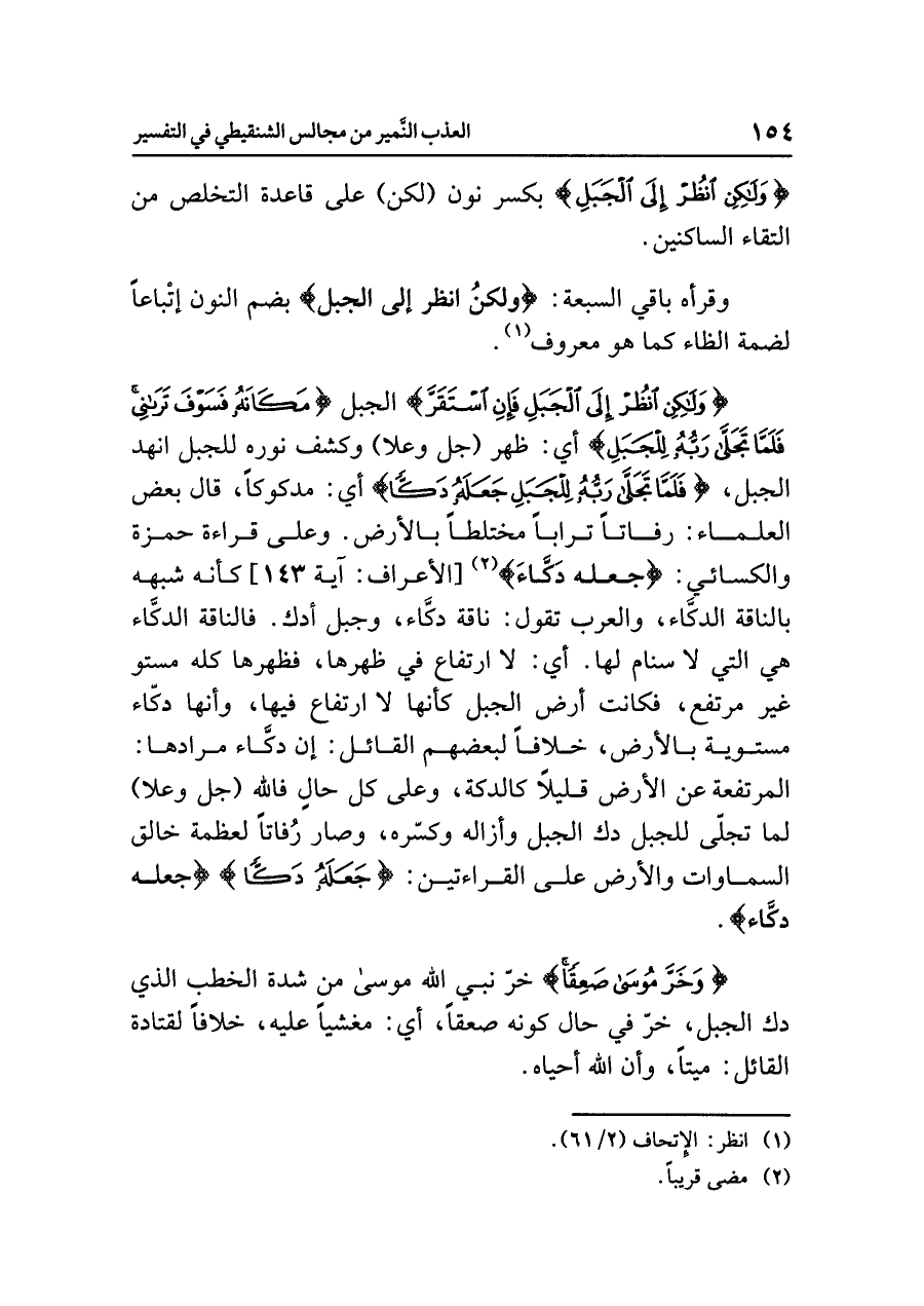 {وَلَكِنِ انظُرْ إِلَى الْجَبَلِ فَإِنِ اسْتَقَرَّ} الجبل {مَكَانَهُ فَسَوْفَ تَرَانِي فَلَمَّا تَجَلَّى رَبُّهُ لِلْجَبَلِ} أي: ظهر (جل وعلا) وكشف نوره للجبل انهد الجبل، {فَلَمَّا تَجَلَّى رَبُّهُ لِلْجَبَلِ جَعَلَهُ دَكًّا} أي: مدكوكًا، قال بعض العلماء: رفاتًا ترابًا مختلطًا بالأرض. وعلى قراءة حمزة والكسائي: {جَعَلَهُ دَكَّاءَ} (¬٢) [الأعراف: آية ١٤٣] كأنه شبهه بالناقة الدكَّاء، والعرب تقول: ناقة دكَّاء، وجبل أَدَكّ. فالناقة الدكَّاء هي التي لا سنامَ لها؛ أي: لا ارتفاع في ظهرها، فظهرها كله مستو غير مرتفع، فكانت أرض الجبل كأنها لا ارتفاع فيها، وأنها دكّاء مستوية بالأرض، خلافًا لبعضهم القائل: إن دكَّاء مرادها: المرتفعة عن الأرض قليلاً كالدكة، وعلى كل حال فالله (جل وعلا) لما تجلَّى للجبل دك الجبل وأزاله وكسَّره، وصار رُفاتًا لعظمة خالق السماوات والأرض على القراءتين: {جَعَلَهُ دَكًّا} {جعله دكَّاء}.